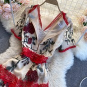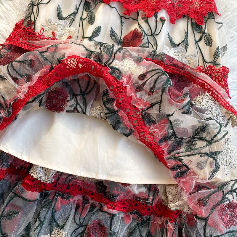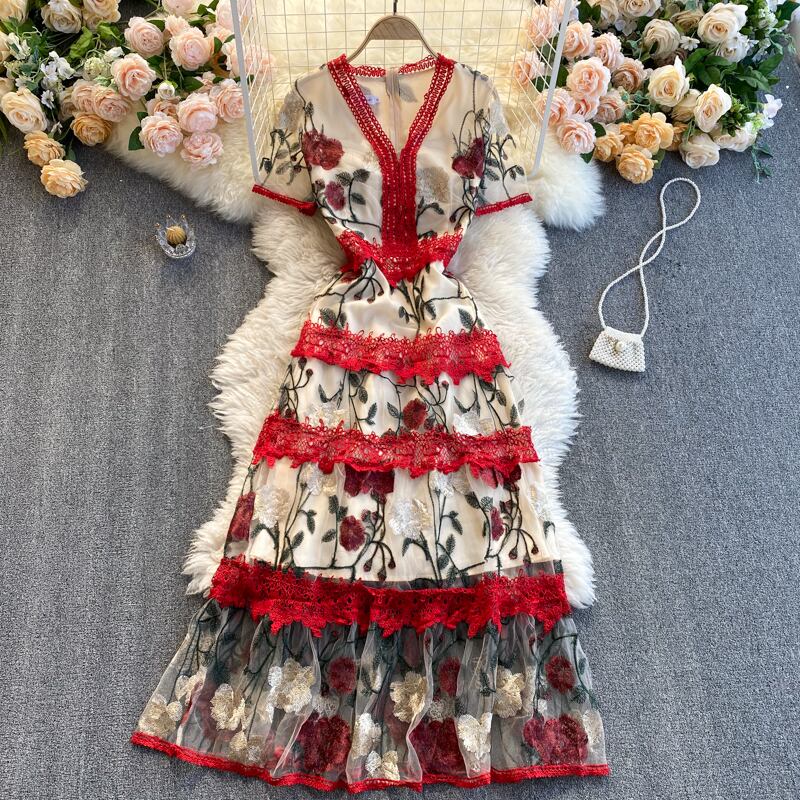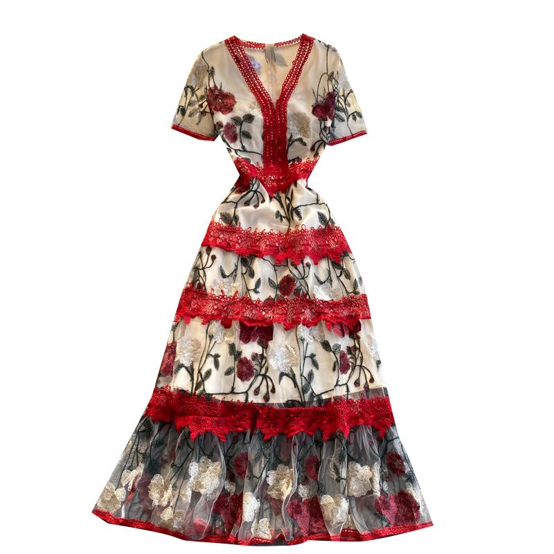 Heavy industry lace embroidery crocheted high-end dress v-neck short-sleeved slim slimming lady temperament French skirt レース 刺繍 スカート Vネック スリム lyxaj18624589001
