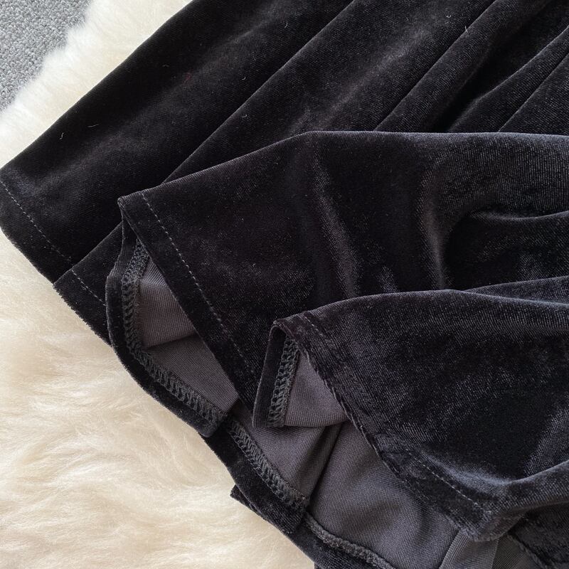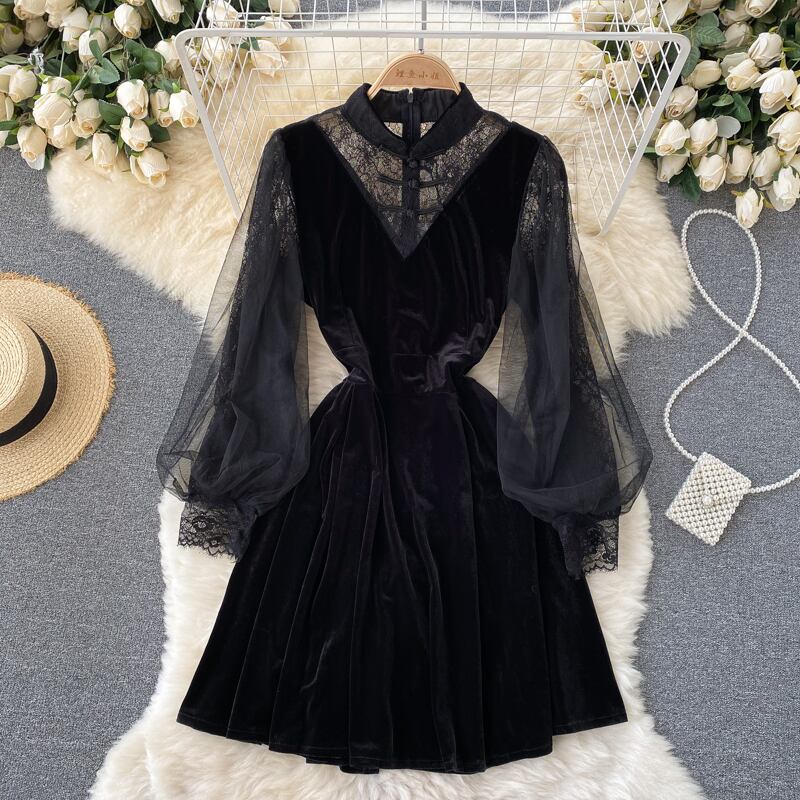 French retro Hepburn velvet dress feminine temperament waist slim fairy lace mesh stitching little black dress ブラック レトロ レース メッシュ スリム ステッチ lyxaj81986929985