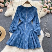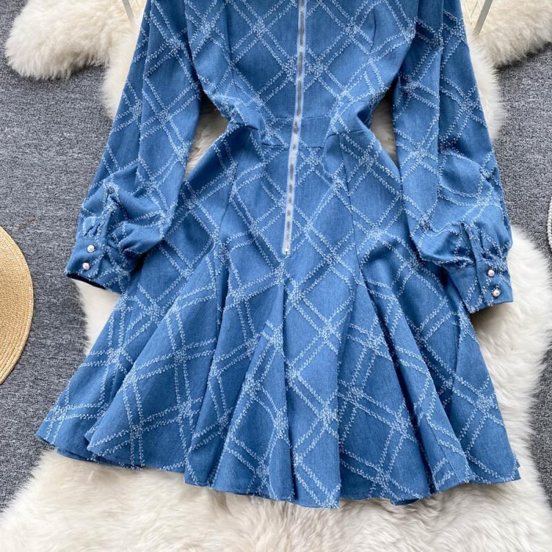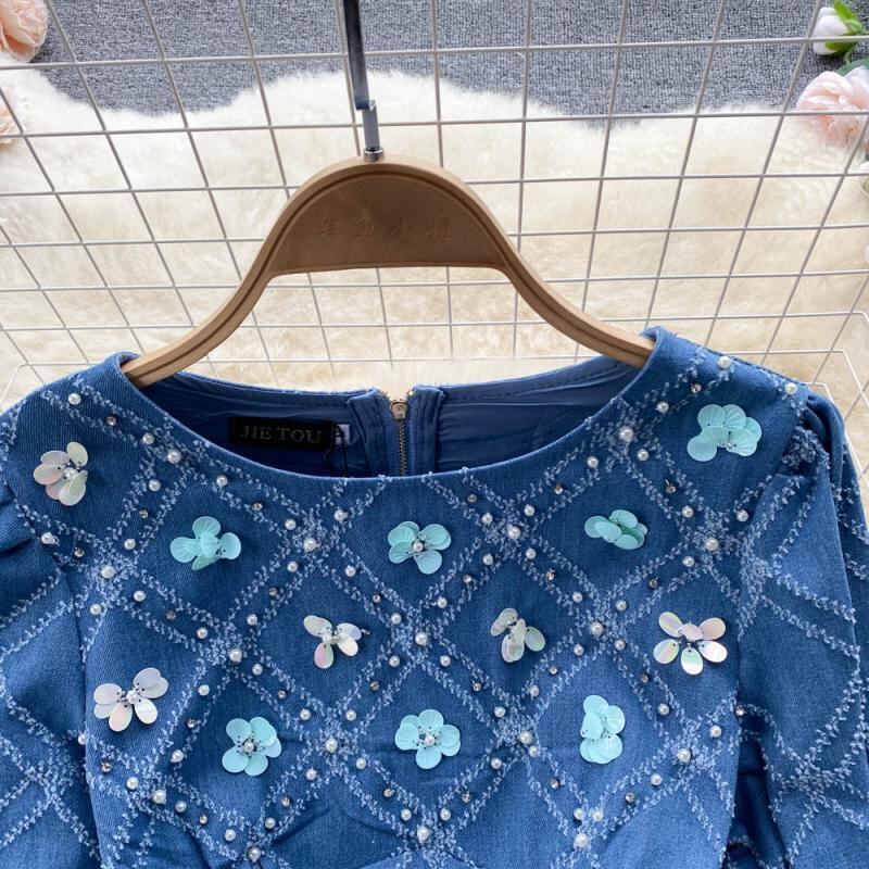 2022 spring high-end light luxury temperament round neck beaded three-dimensional flower sequins waist puffy denim dress スプリング 春物 Oネック フラワーデザイン lyxaj98523075846