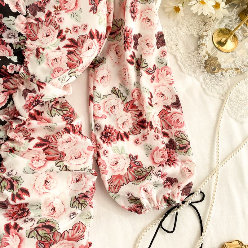 European and American ins fashion bloggers with the same eign style lantern sleeves color-blocked pleated self-cultivation bag hip floral dress ランタンスリーブ プリーツ 花柄 ヨーロピアン lyxaj70370466523