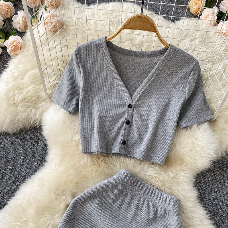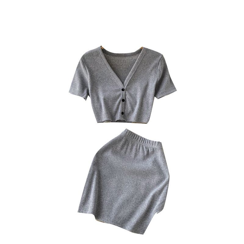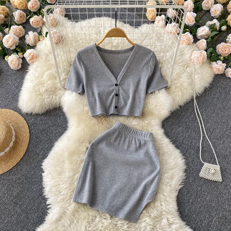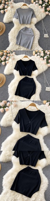 Pure lust suit short knitted V-neck short-sleeved top cardigan high waist bag hip skirt two-piece set ハイウェスト ショート カーディガン スカート Vネック lyxaj88105665058