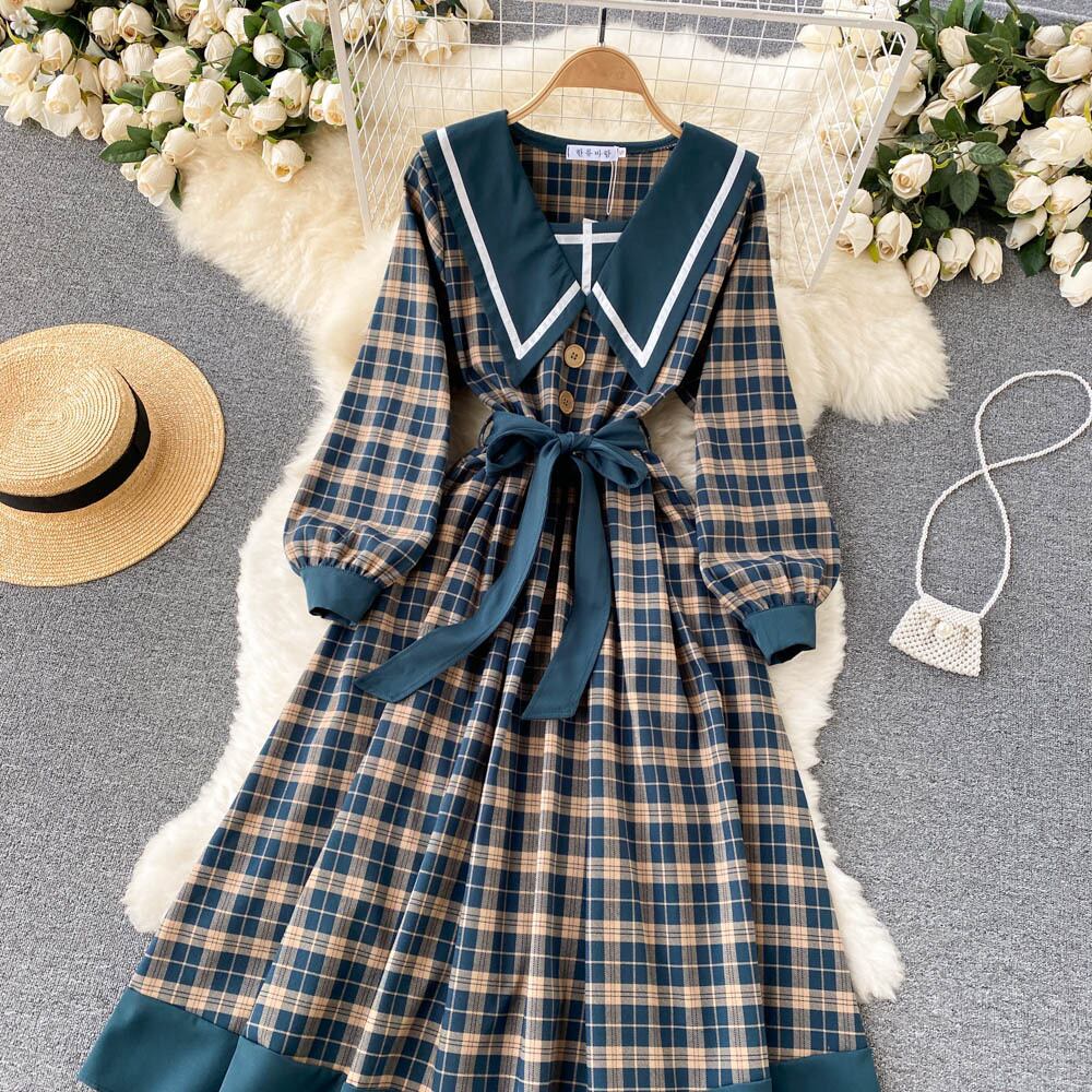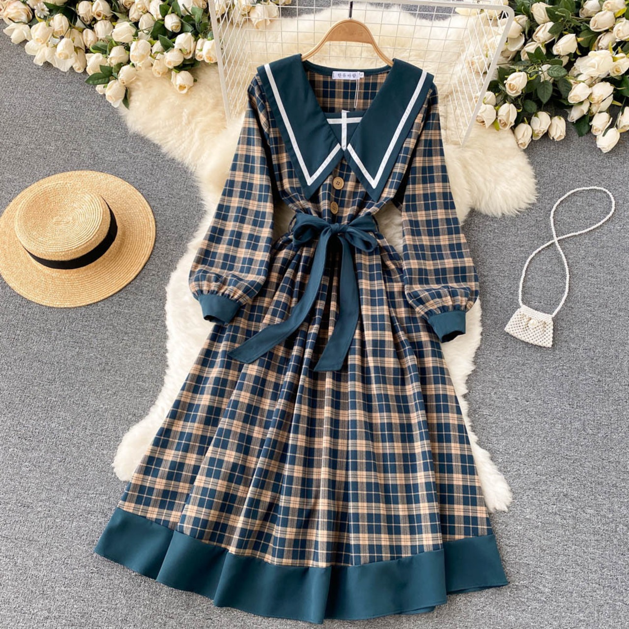French retro plaid doll collar dress waist slim temperament age reduction college style sweet first love midi skirt レトロ 大人ガーリー スウィート キュート カジュアル スカート スリム lyxaj3682280018