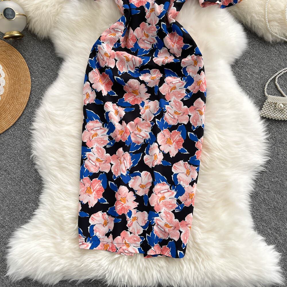 Improved cheongsam retro lady temperament self-cultivation French first love floral dress beaded print Western-style hip skirt レトロ 花柄 スカート lyxaj88431957254