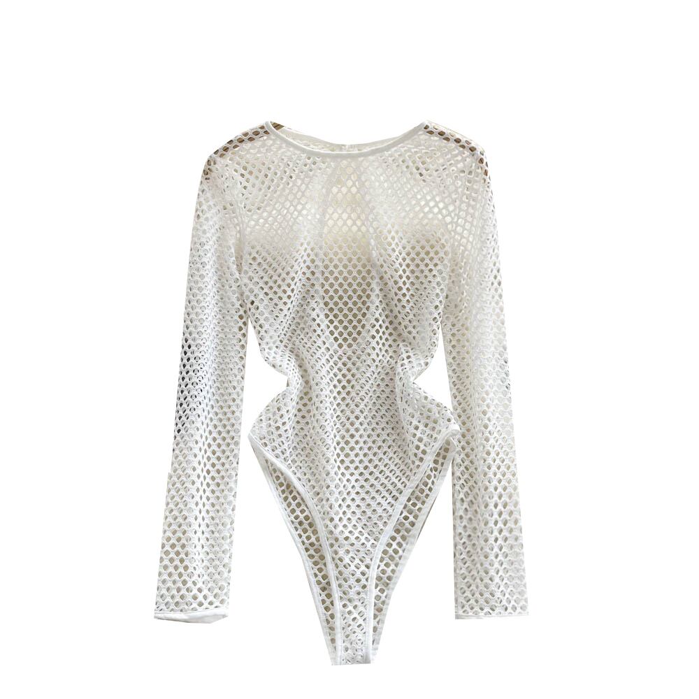 2022 European and American top sexy white mesh perspective hollow long-sleeved jumpsuit slim fit round neck blouse trendy ロング ホワイト ブラウス メッシュ Oネック スリム ヨーロピアン lyxaj29224371514
