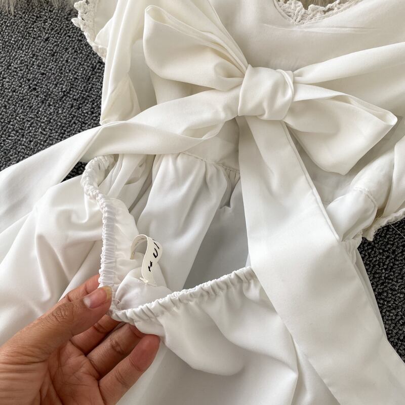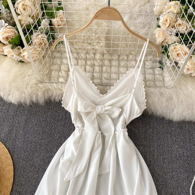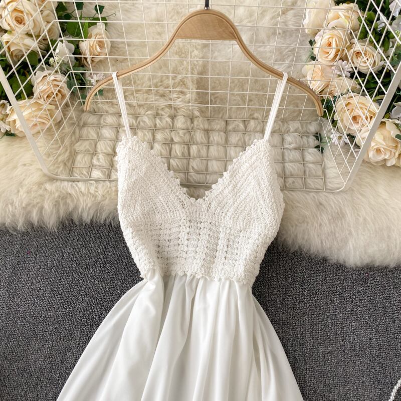 Retro crocheted knitted temperament V-neck sexy backless straps waist slim holiday style suspender dress goddess レトロ Vネック スリム lyxaj75612262425
