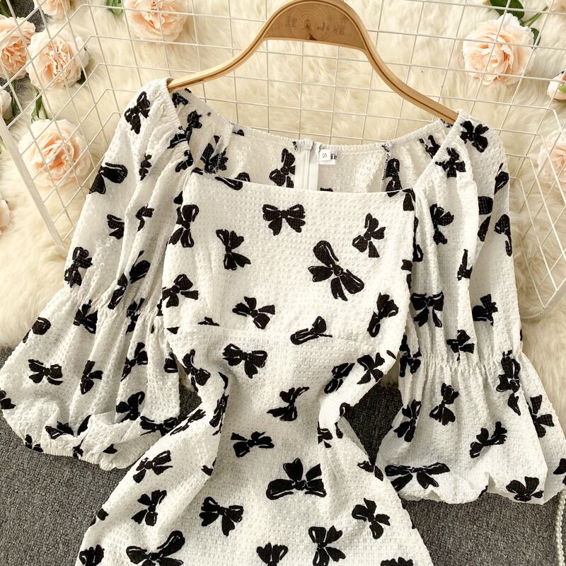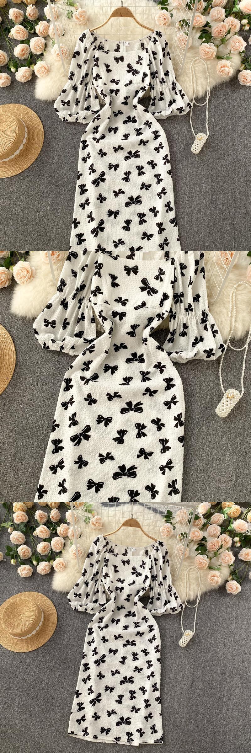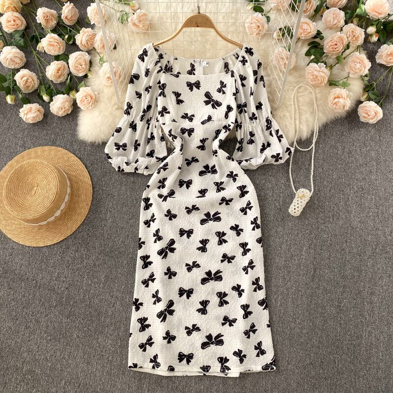 Early spring new style bow floral long-sleeved dress female version fashion chiffon waist slim temperament long skirt ロング シフォン リボン スプリング 春物 花柄 スカート スリム lyxaj88570458604