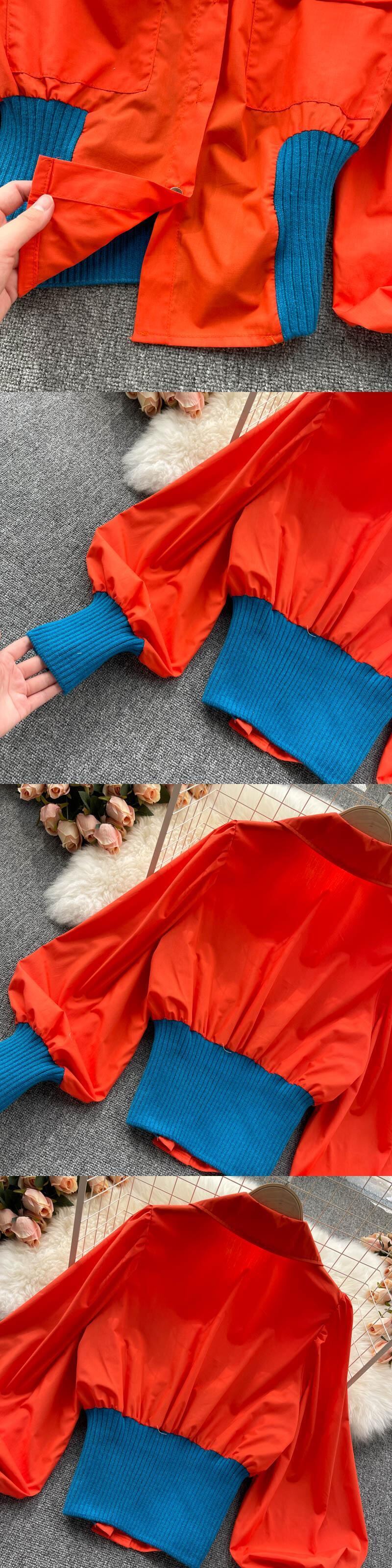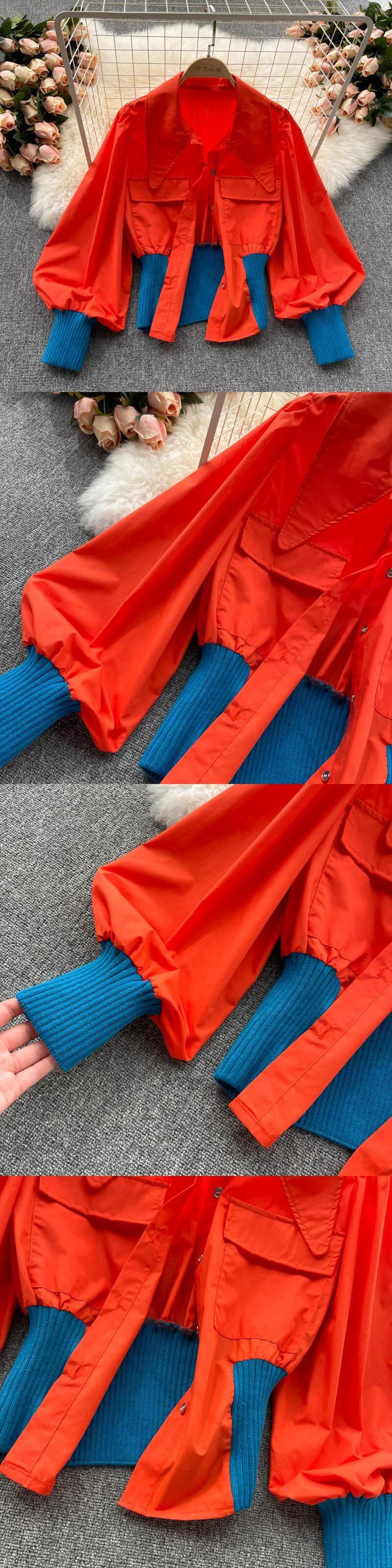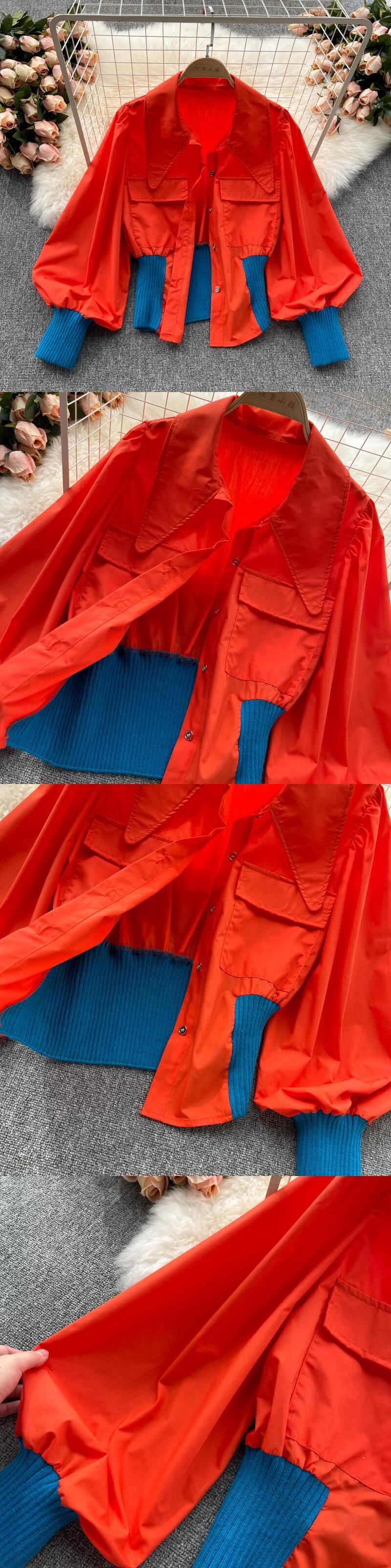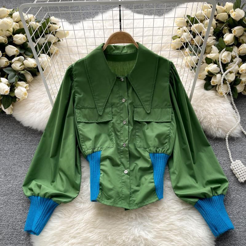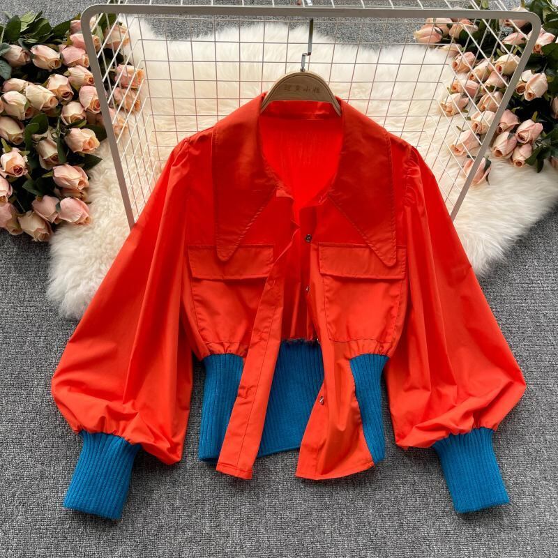 Hong Kong style contrast color shirt 2021 autumn new stand collar lantern sleeve waist all-match double pocket tooling top women ランタンスリーブ オータム 秋物 lyxaj55288414535