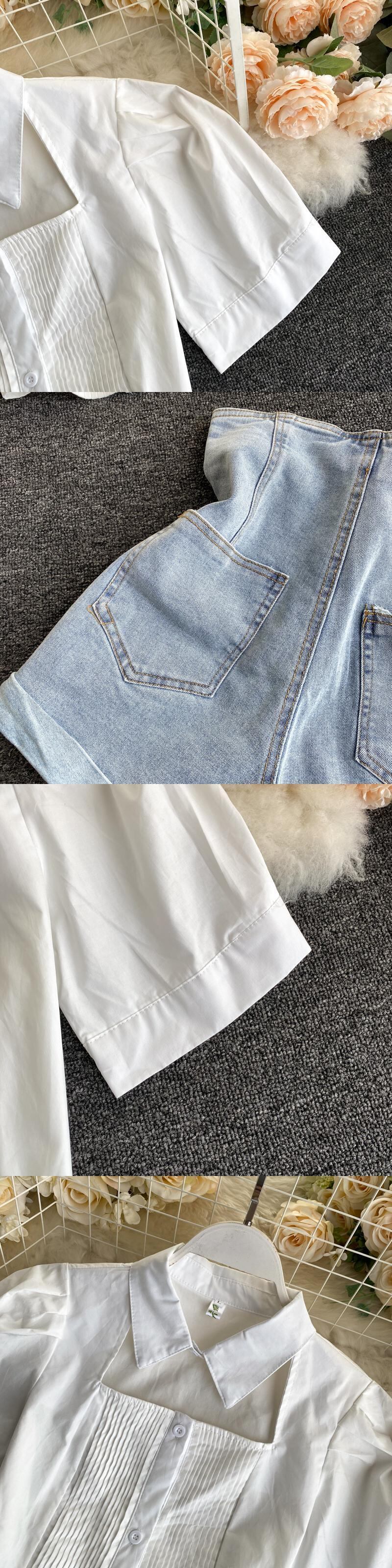 Girly wear suit sweet and careful machine hollow design shirt short high waist denim shorts two-piece set ハイウェスト ショート 大人ガーリー スウィート キュート カジュアル ショーツ ブルマー lyxaj25225110359