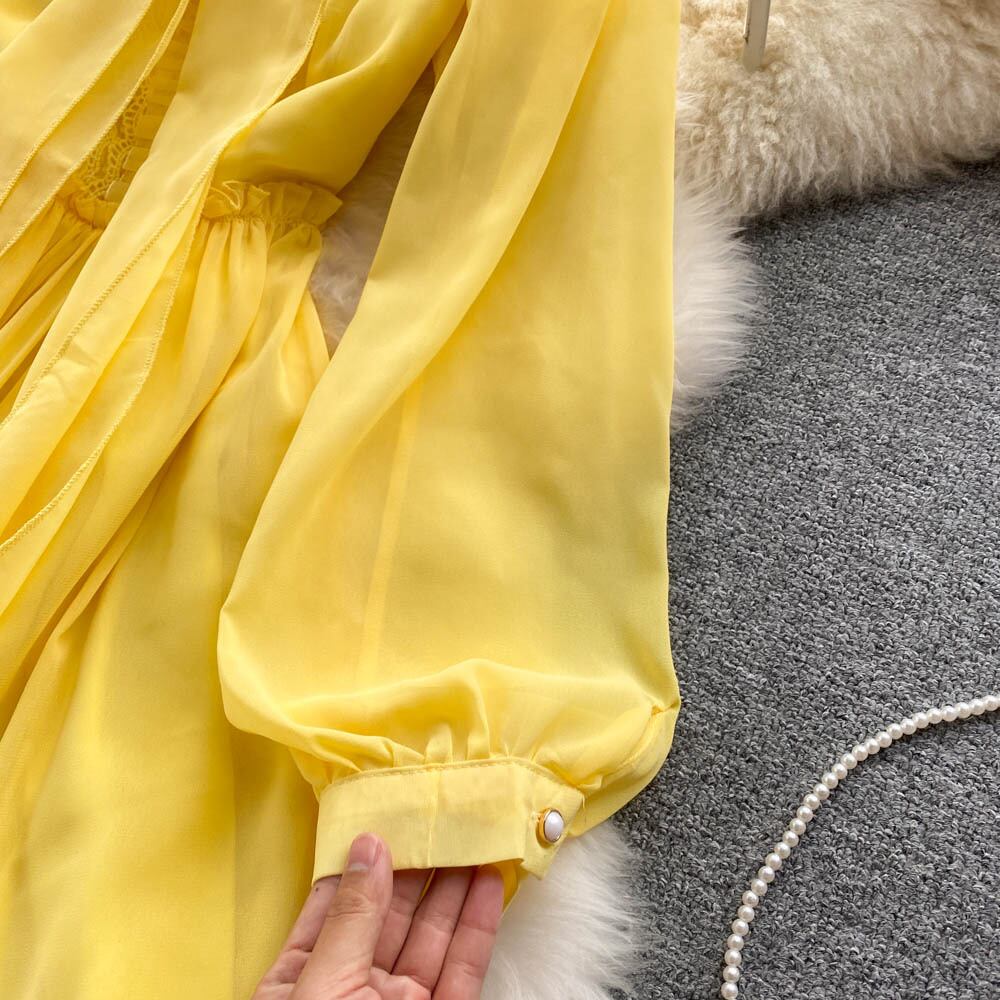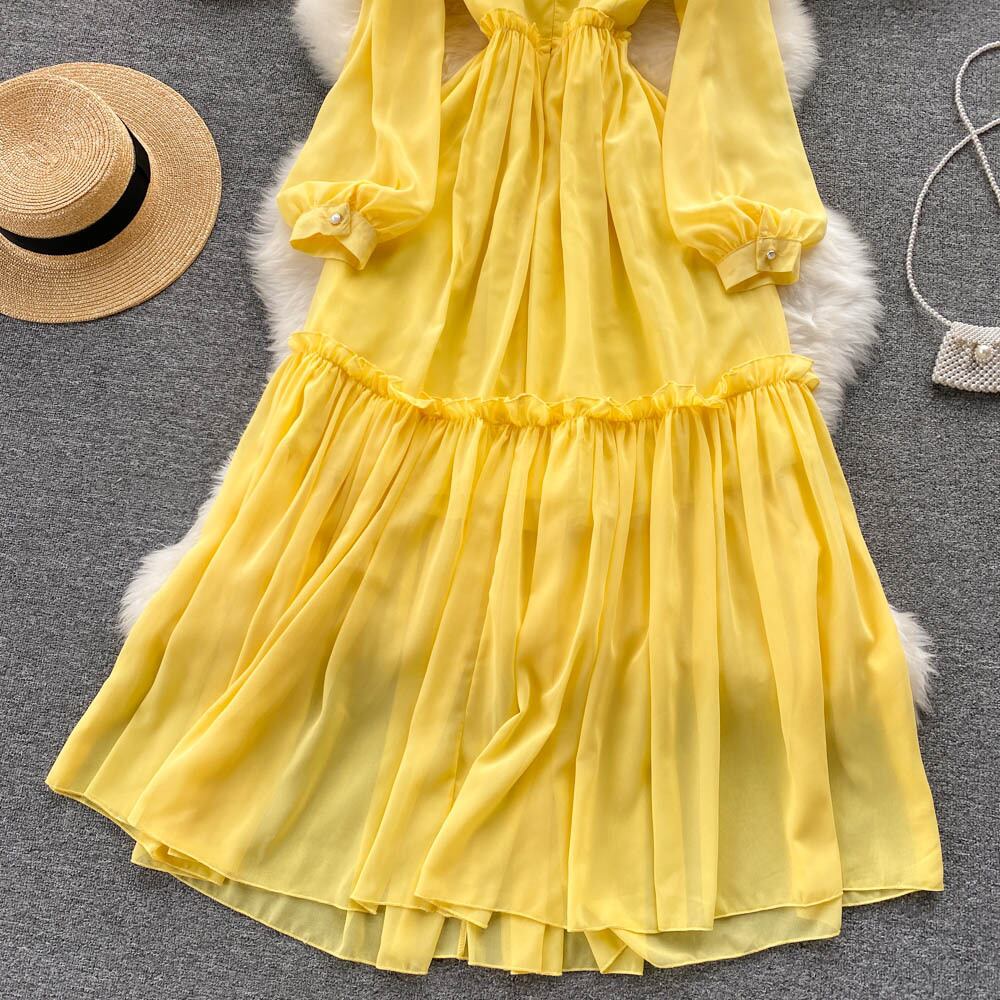 Light mature women's clothing temperament super fairy yellow chiffon dress waist slim seaside holiday skirt big swing long skirt ロング シフォン スカート スリム lyxaj76494302714