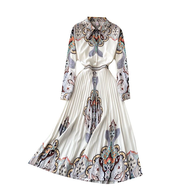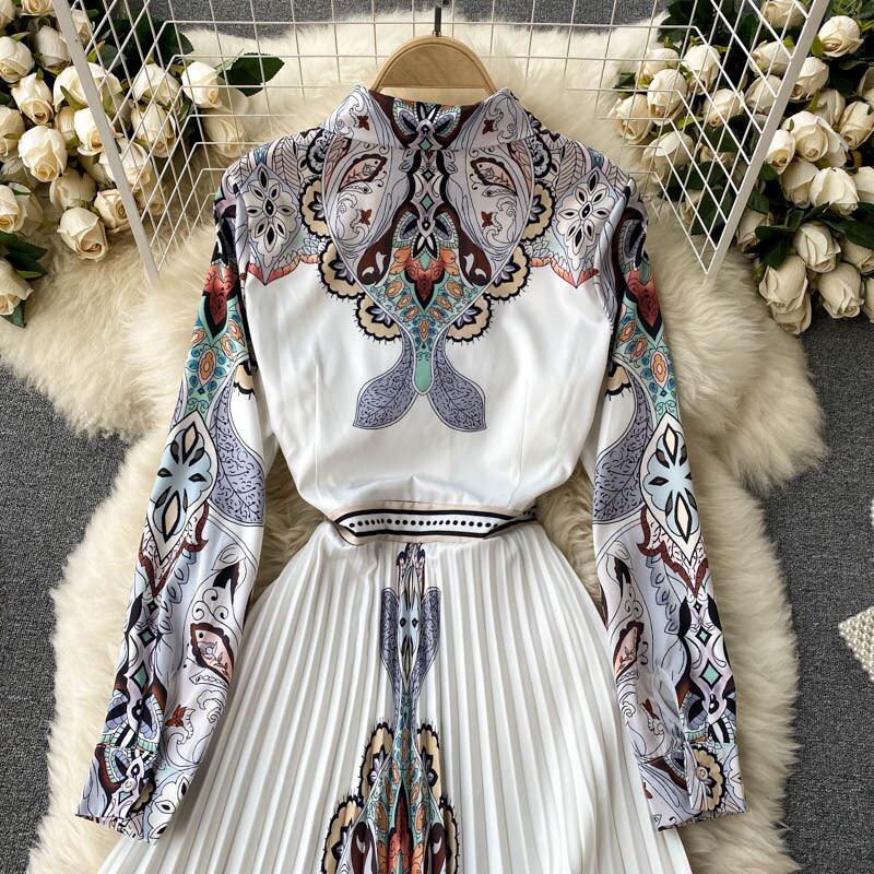 European station 2021 early spring new shirt women's design sense niche printing long-sleeved waist-less pleated dress ロング プリーツ スプリング 春物 ヨーロピアン lyxaj2604363985