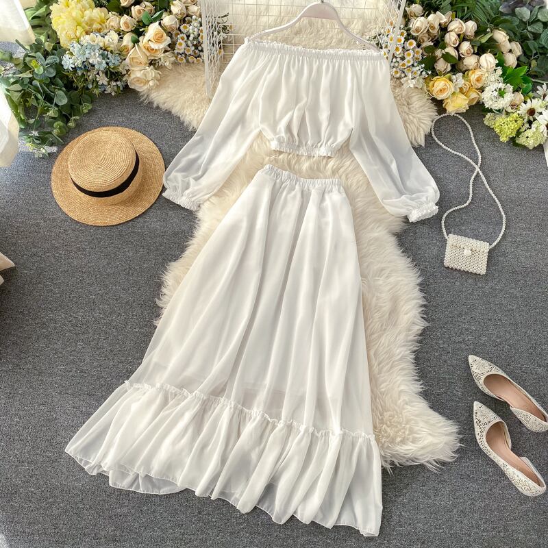 Holiday style suit one-word collar long-sleeved short waistless chiffon top + elastic waist ruffled large swing long skirt women ショート ロング シフォン エラスティック 伸縮 スカート lyxaj41571155804