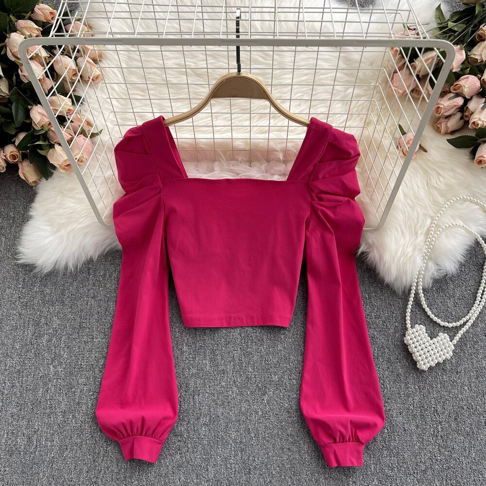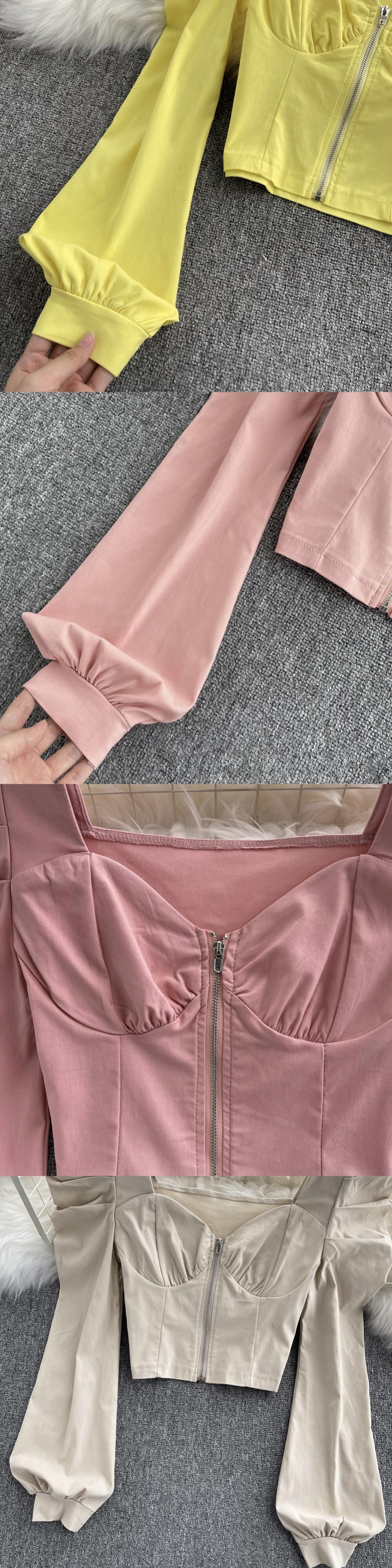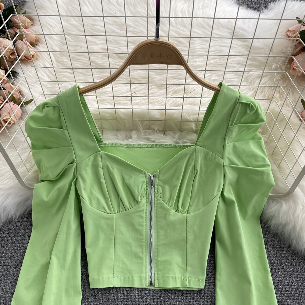 Early autumn French top women's design sense niche temperament square collar zipper slim fit short eign style puff sleeve shirt trendy ショート オータム 秋物 スリム スクウェア lyxaj4902848832