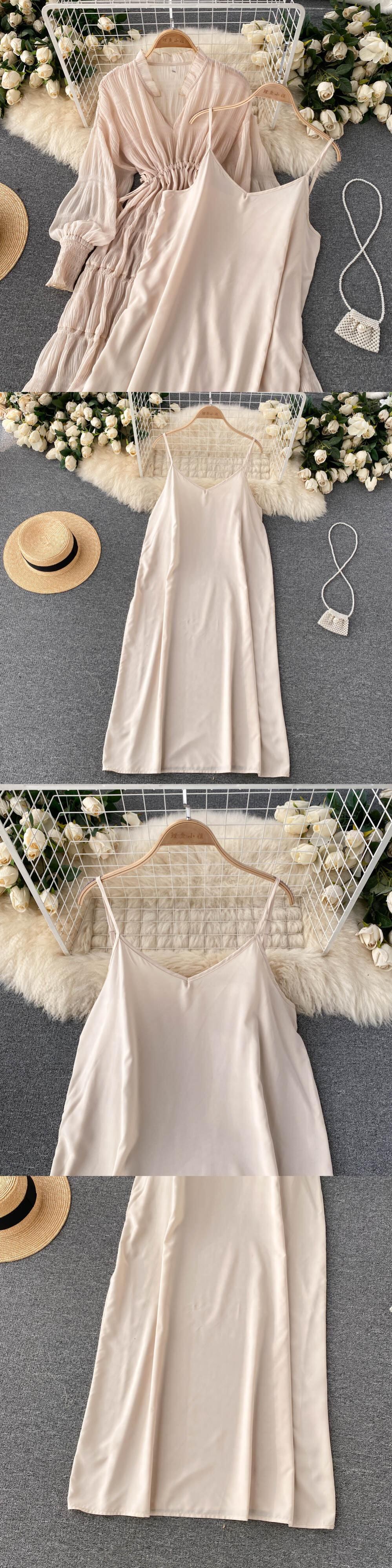 Travel po vacation dress goddess fan temperament V-neck drawstring waist is thin and folded super fairy chiffon long skirt ロング シフォン スカート Vネック lyxaj97803941214