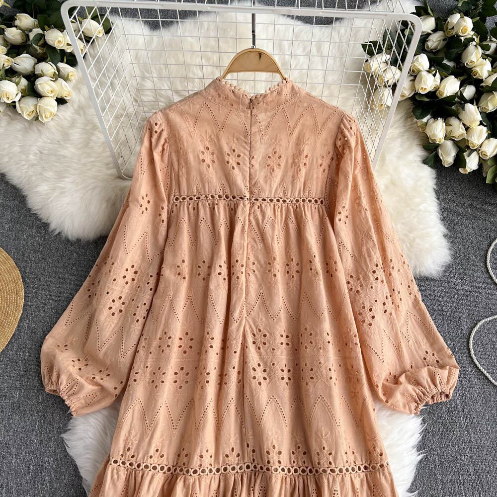 Literary small fresh round neck hollow flower embroidery loose long skirt holiday style French temperament puff sleeve dress ロング 刺繍 スカート Oネック フラワーデザイン lyxaj97807411589