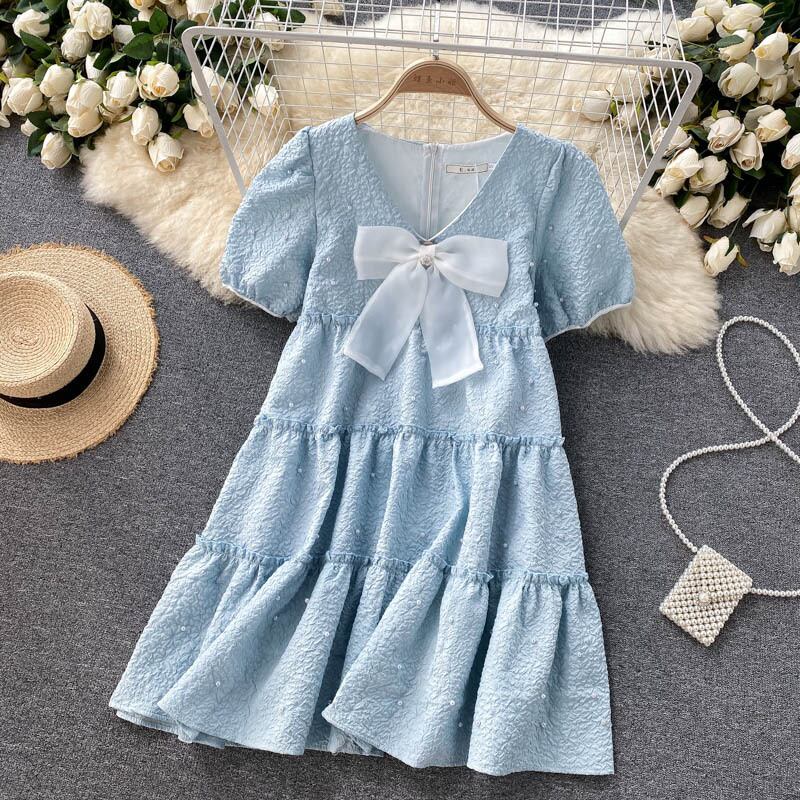 version dress 2021 new summer dress women's sweet bow nail beaded eign puff sleeves age-reducing doll skirt リボン 大人ガーリー スウィート キュート カジュアル サマー 夏物 スカート lyxaj19893249580