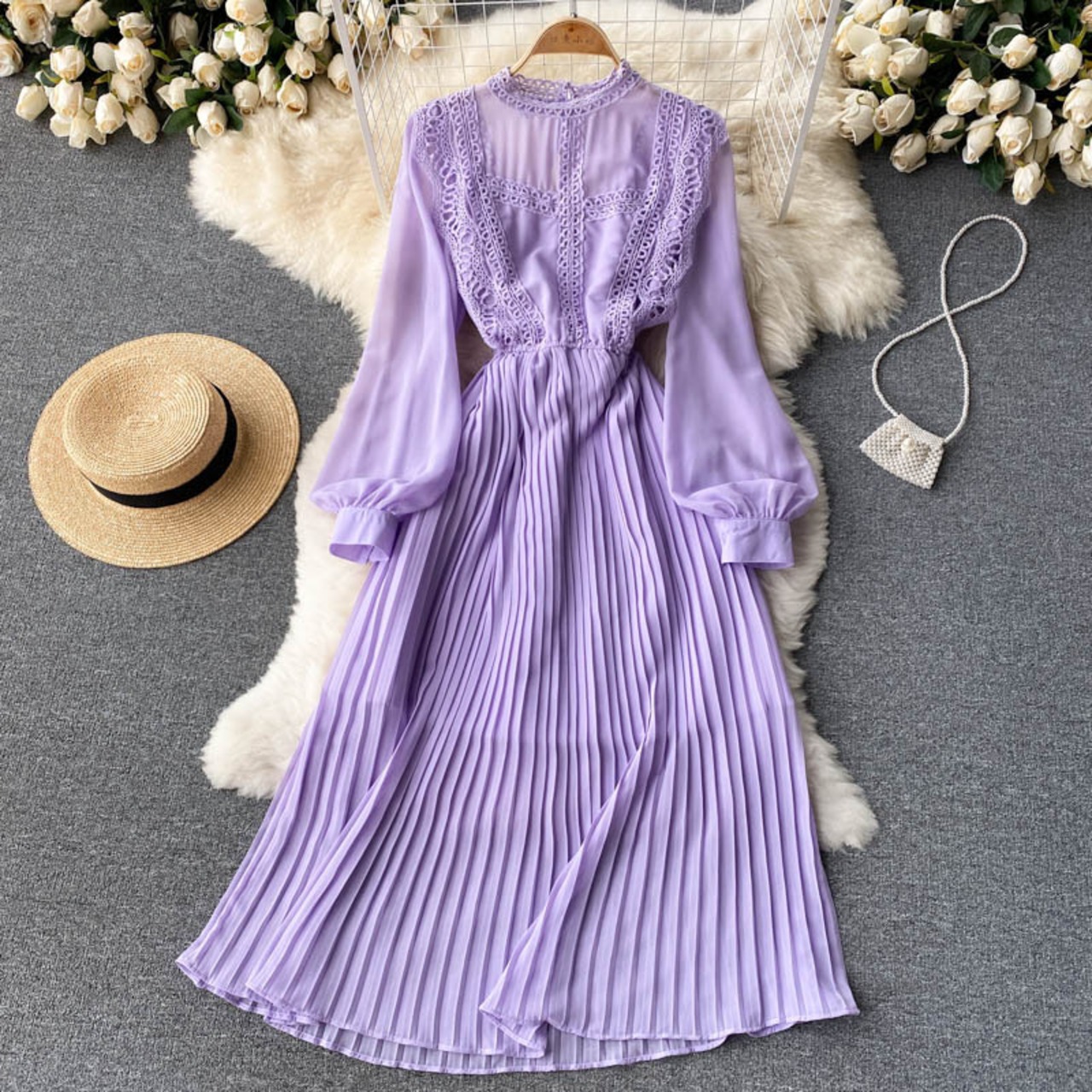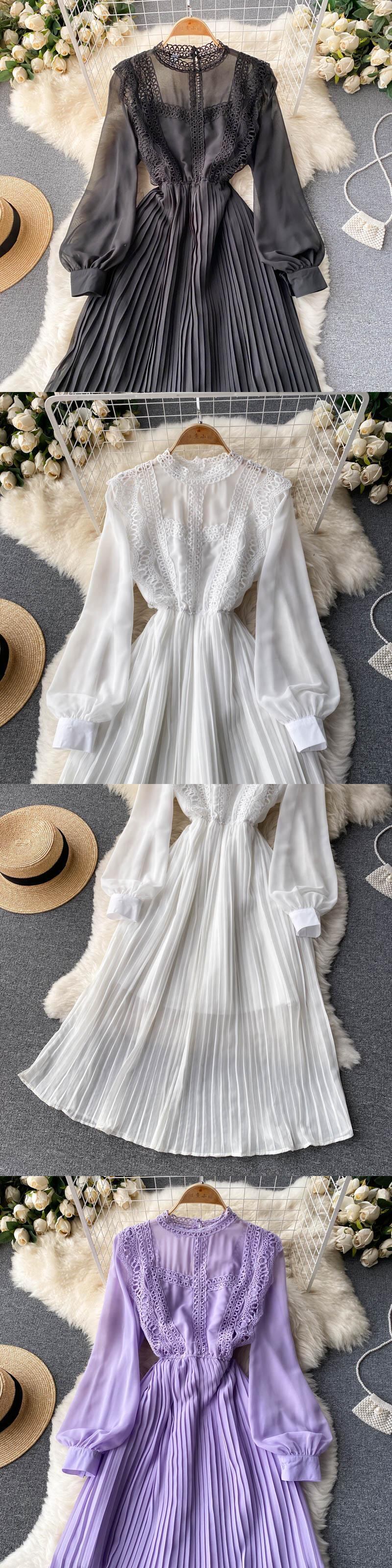 National style 2021 autumn new style pleated lace waist long-sleeved dress women's large swing elegant over-the-knee long skirt ロング レース エレガント プリーツ オータム 秋物 スカート lyxaj43012659466