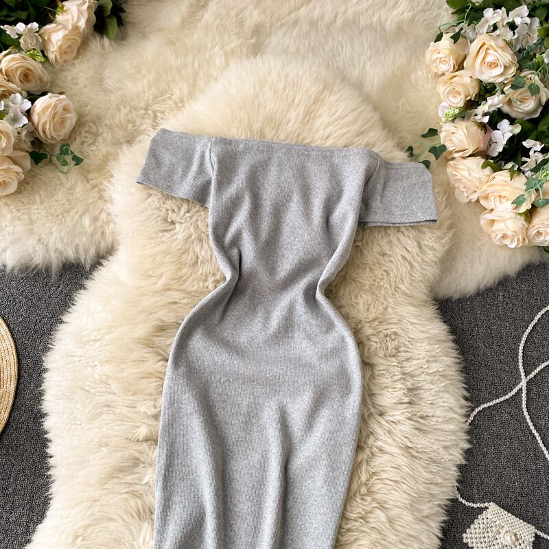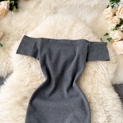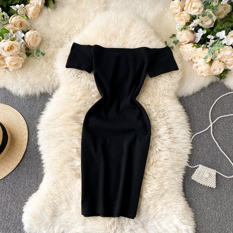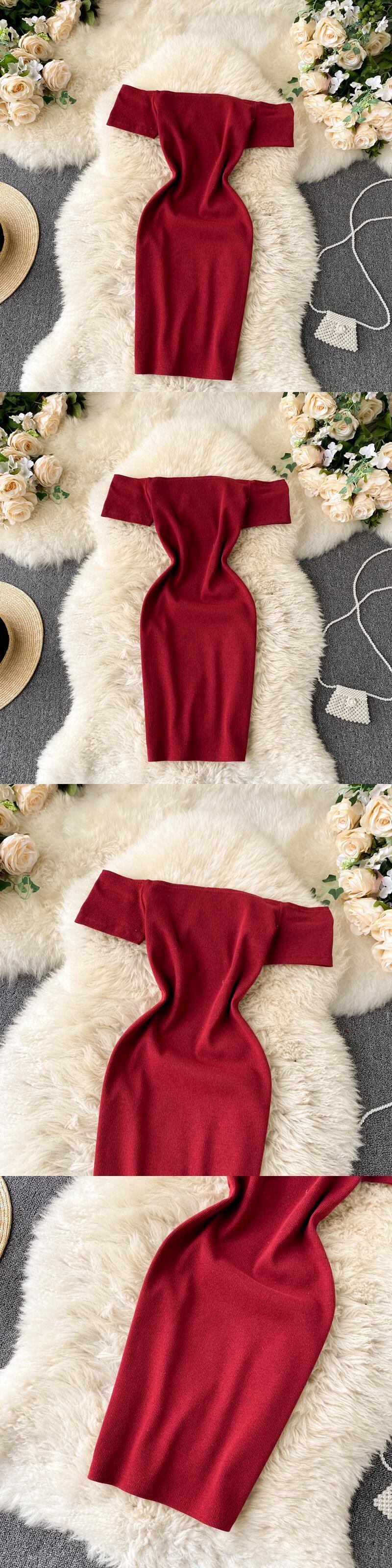 2021 new retro solid color temperament one-word collar off-the-shoulder short-sleeved waist slim sexy hip dress chic レトロ スリム ソリッドカラー lyxaj12400856518