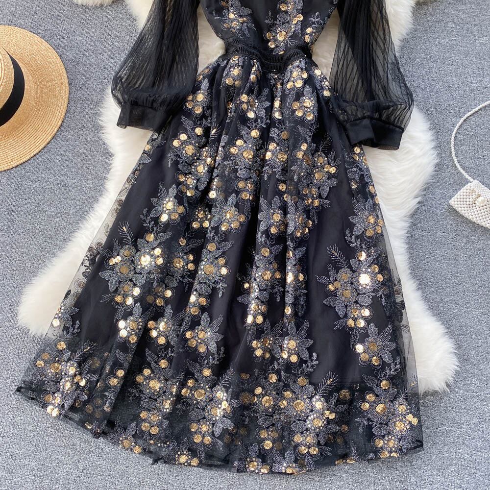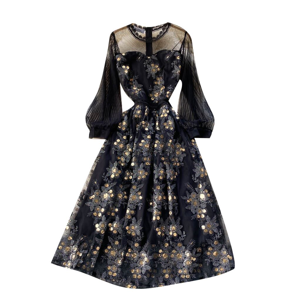 -end temperament French dress waist slimming heavy-duty embroidery stitching mesh high-end dress over the knee long skirt ロング 刺繍 メッシュ スカート ステッチ lyxaj25470261460