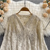2021 early autumn new French retro sexy lace flocking lantern sleeve shirt women's all-match v-neck cardigan top ランタンスリーブ レトロ レース カーディガン オータム 秋物 Vネック lyxaj62947110929