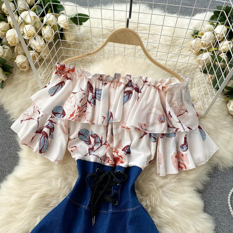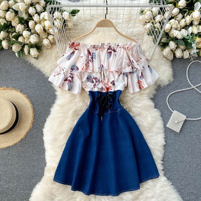 Sweet fungus edge one-word neck off-the-shoulder printed lotus leaf edge contrast color stitching high waist slim denim dress women's tide ハイウェスト プリント 大人ガーリー スウィート キュート カジュアル スリム ステッチ lyxaj44474537533