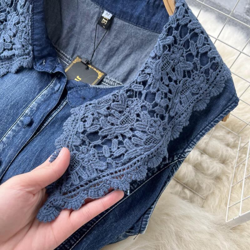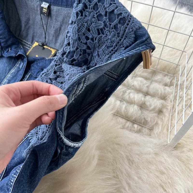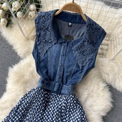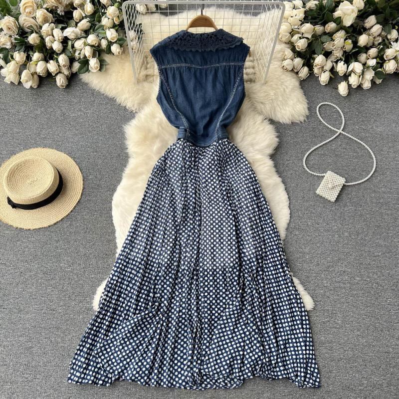 Light familiar style doll collar, high waist and thin, feminine denim stitching polka dot dress, elegant sleeveless long skirt ハイウェスト ロング エレガント ノースリーブ スカート ステッチ lyxaj95498522327