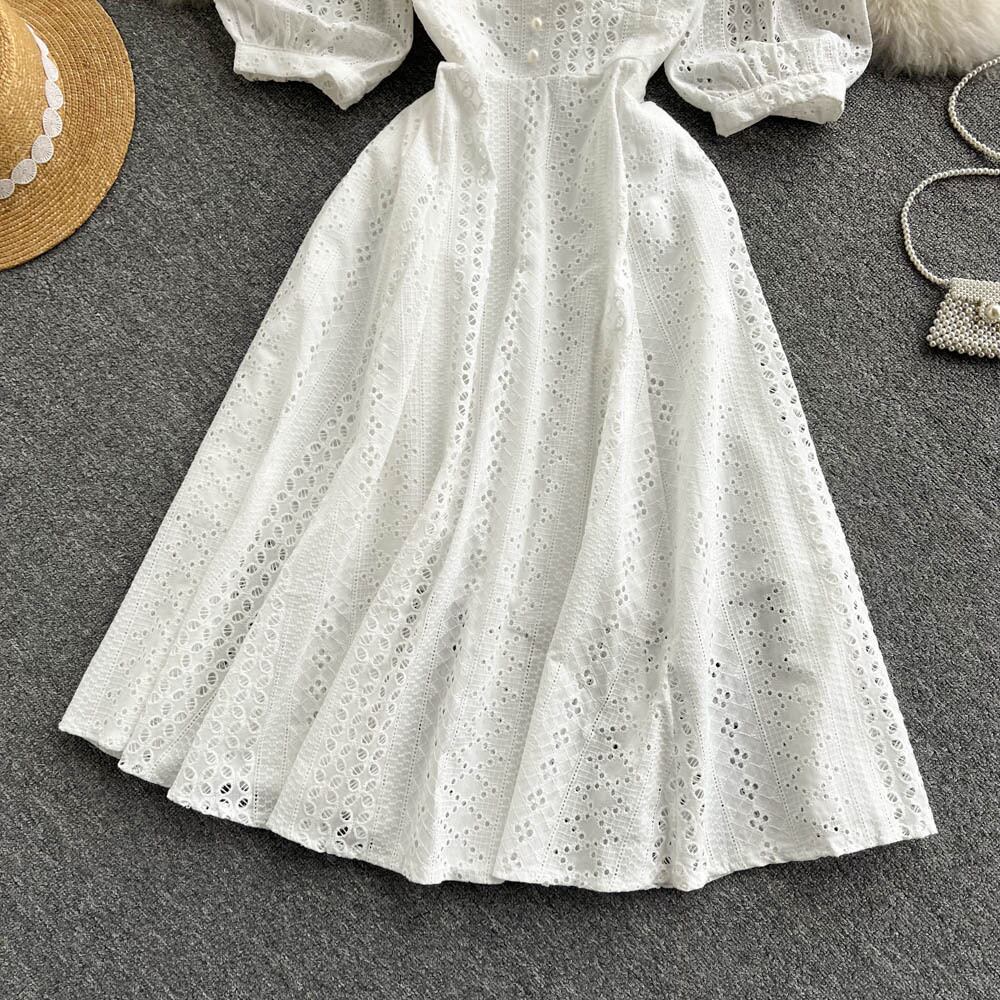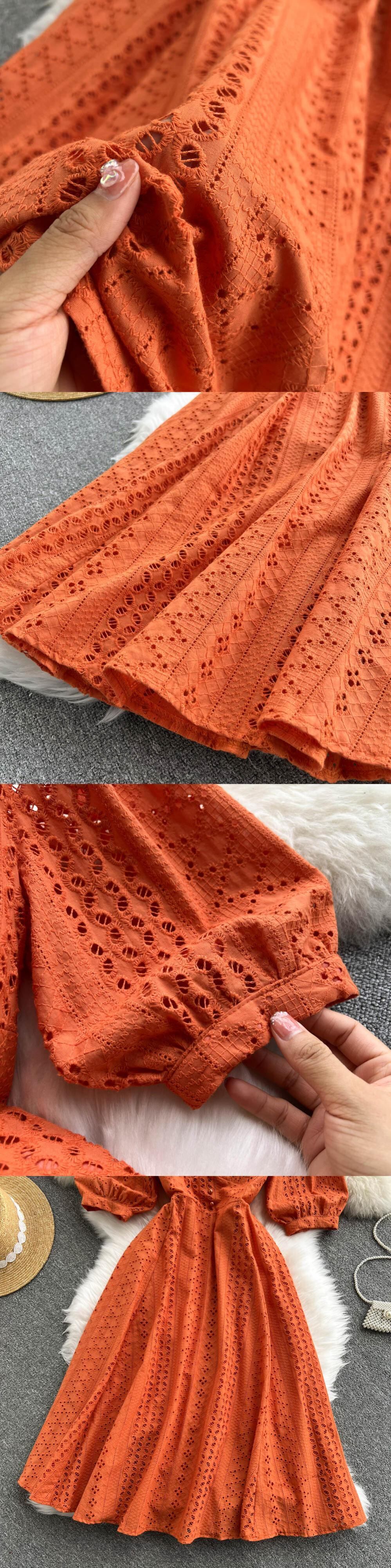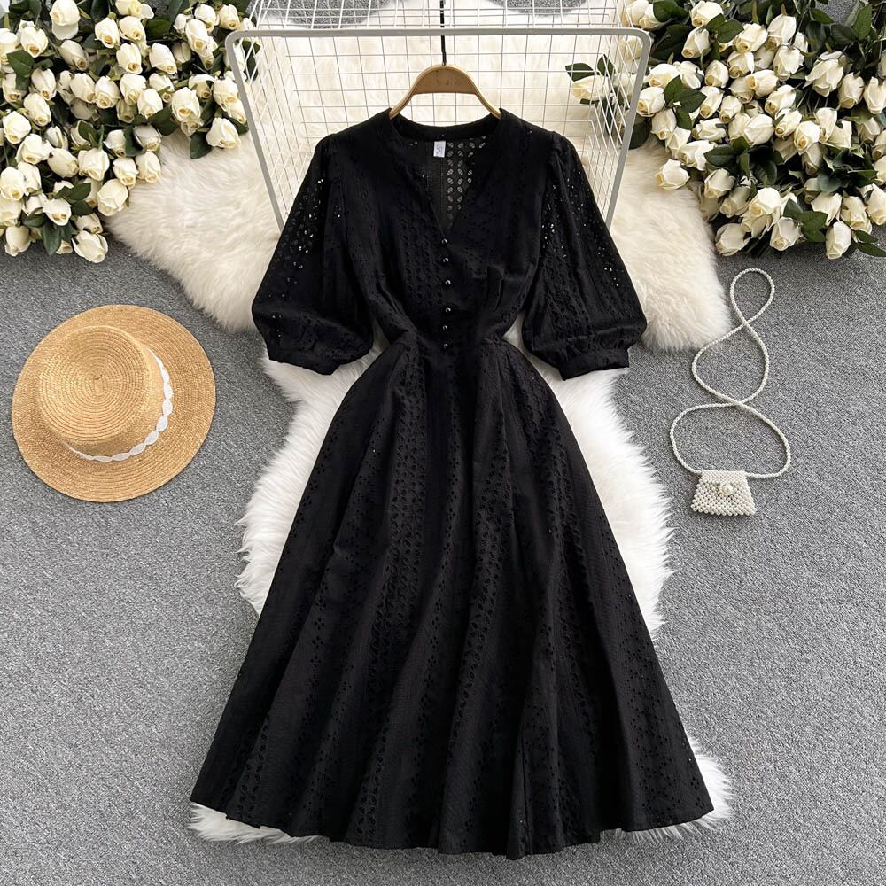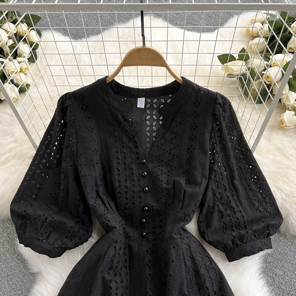 French Dress Autumn 2021 Feminine V-neck Heart Machine Hollow Puff Sleeves Age-Reducing Mid-Length Skirt オータム 秋物 スカート Vネック lyxaj79194405795
