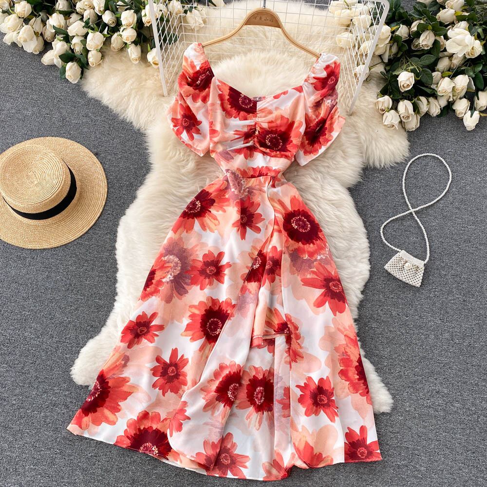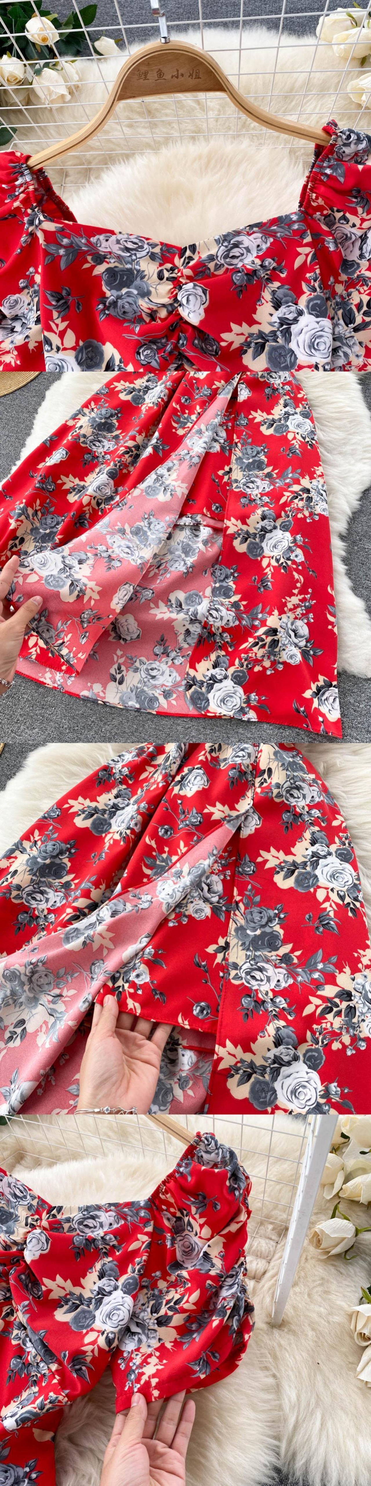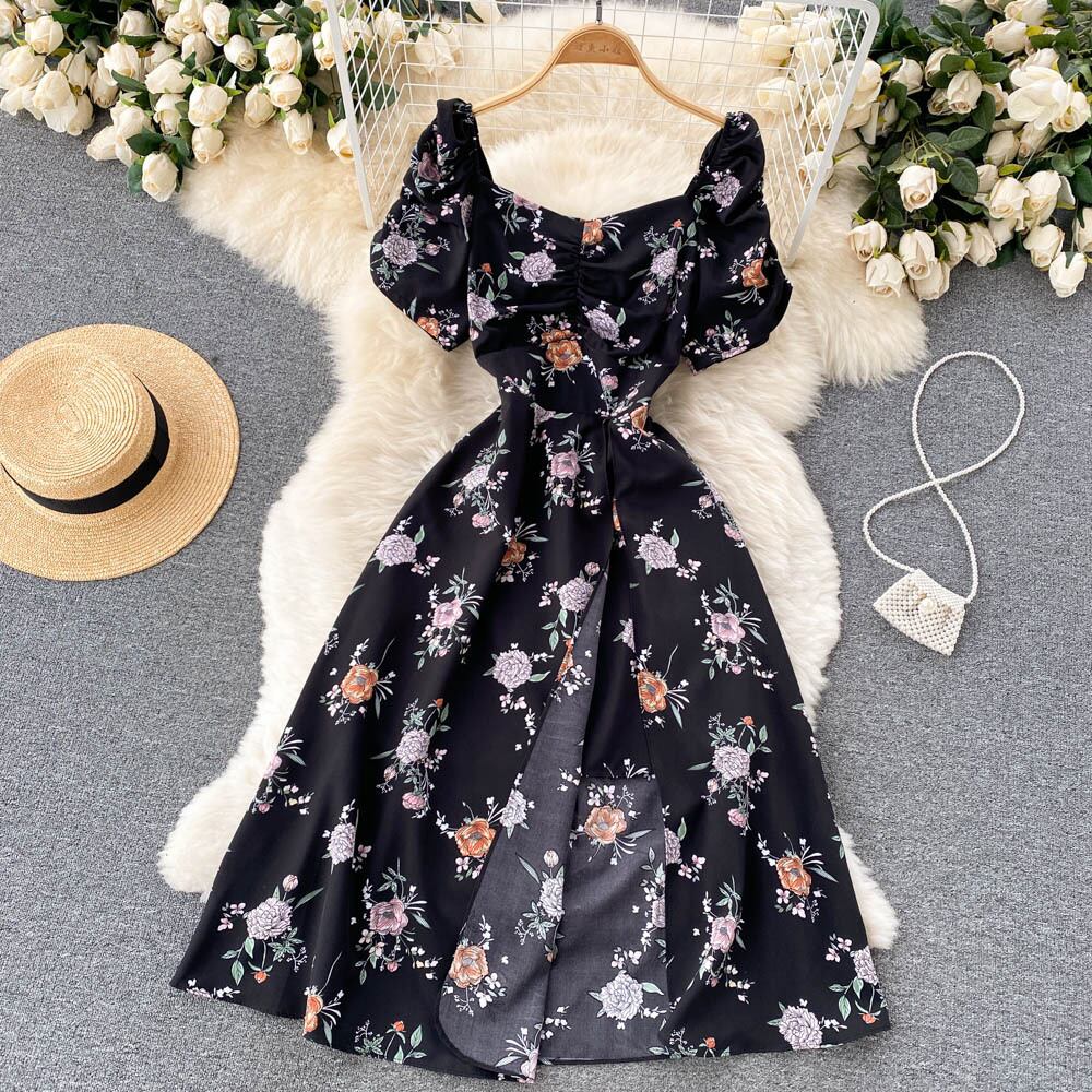 French retro tie-dye print square neck puff sleeve dress high waist slim elegant feminine temperament midi skirt ハイウェスト レトロ エレガント スカート スリム スクウェア lyxaj32943979233