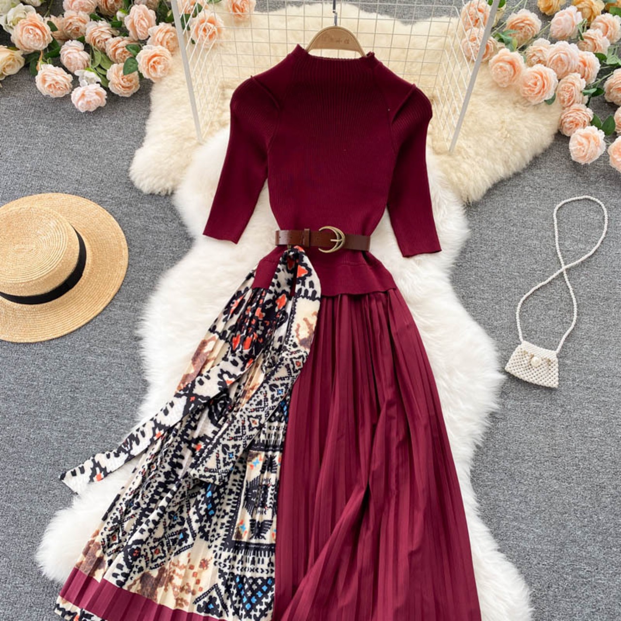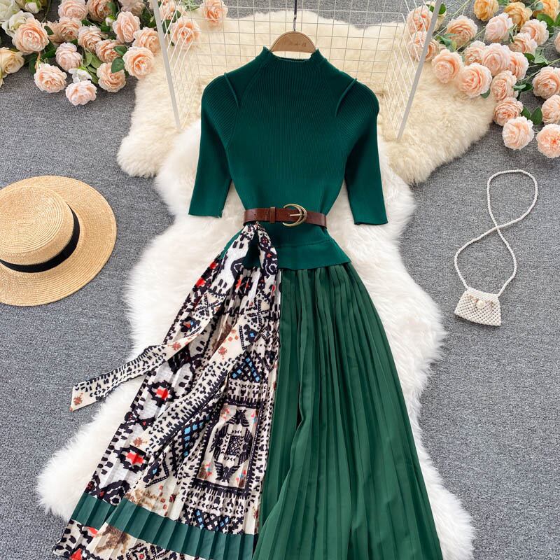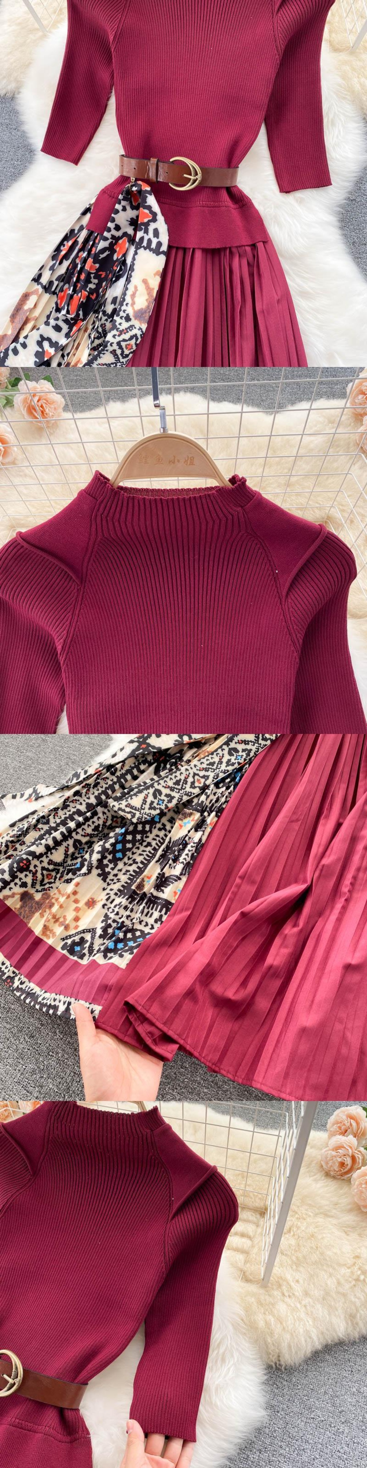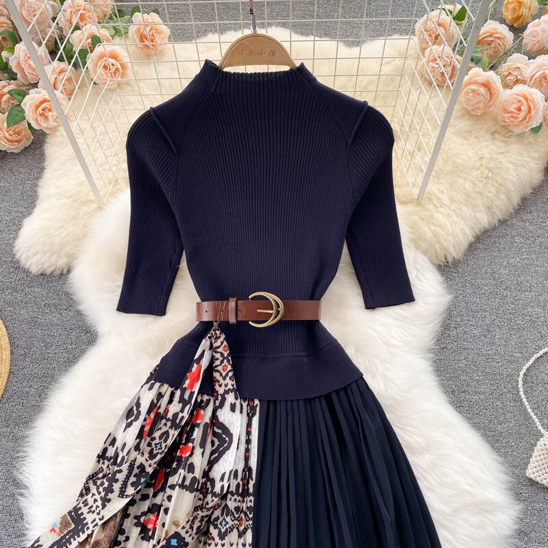 Autumn knitted dress niche popular design fake two-piece stitching heavy-duty pleated print temperament mid-length skirt プリーツ オータム 秋物 スカート ステッチ lyxaj91094104113