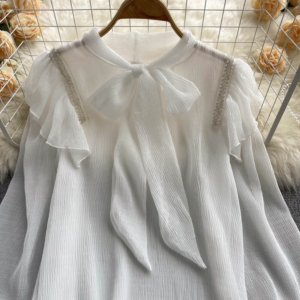 2022 spring new temperament sweet ruffled bow tie chiffon shirt top design shirt シフォン リボン 大人ガーリー スウィート キュート カジュアル スプリング 春物 lyxaj54422208536