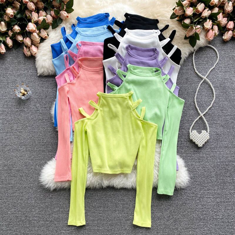 Light European and American tops, women's design sense, niche, scheming, hanging neck, hollow, off-the-shoulder, long-sleeved, sexy, cropped navel, short T-shirt, trendy ショート ロング Tシャツ ヨーロピアン lyxaj27993710047