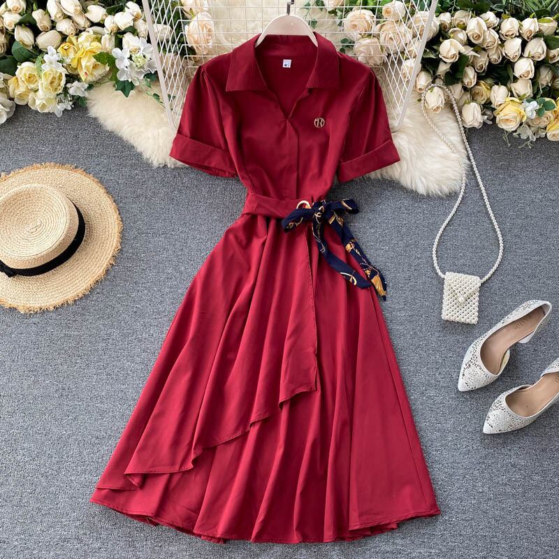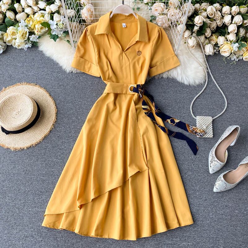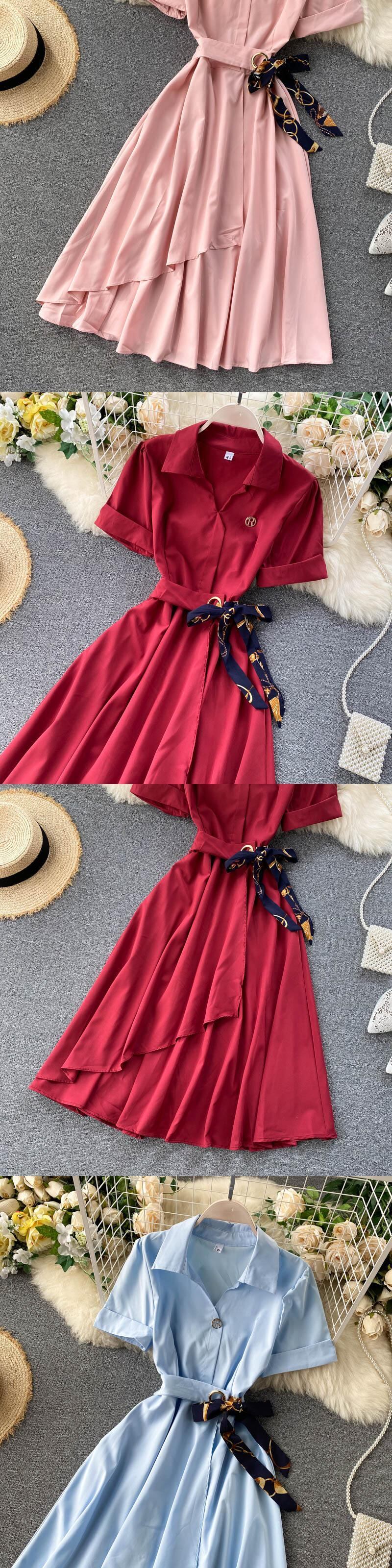 Commuter women's short-sleeved shirt women's design sense small irregular A-line large swing ribbon tie waist dress Aライン lyxaj25567575363