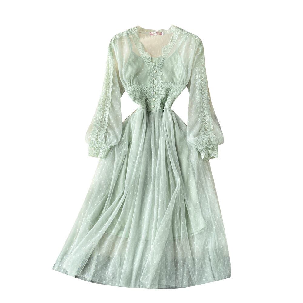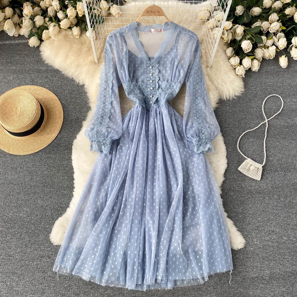 temperament lace lace V-neck french dress with waist and thin scheming perspective fairy mesh midi skirt レース メッシュ スカート Vネック lyxaj52373381528