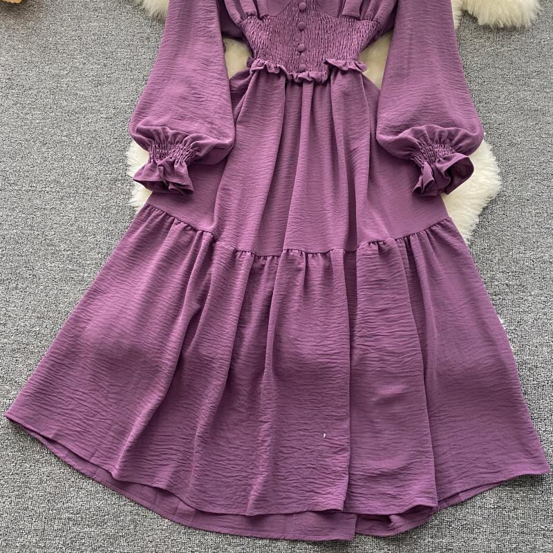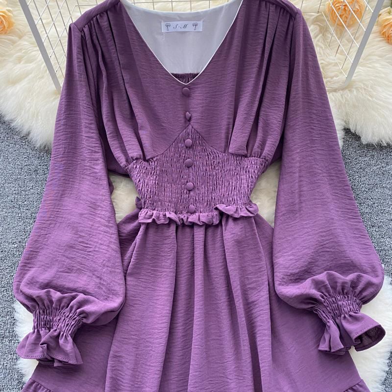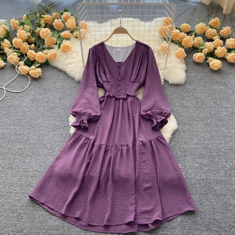 The v-neck temperament long skirt has a small design and a small waist, which is thin and puff sleeves. Retro French long-sleeved knee-length dress ロング レトロ スカート Vネック lyxaj25891024666