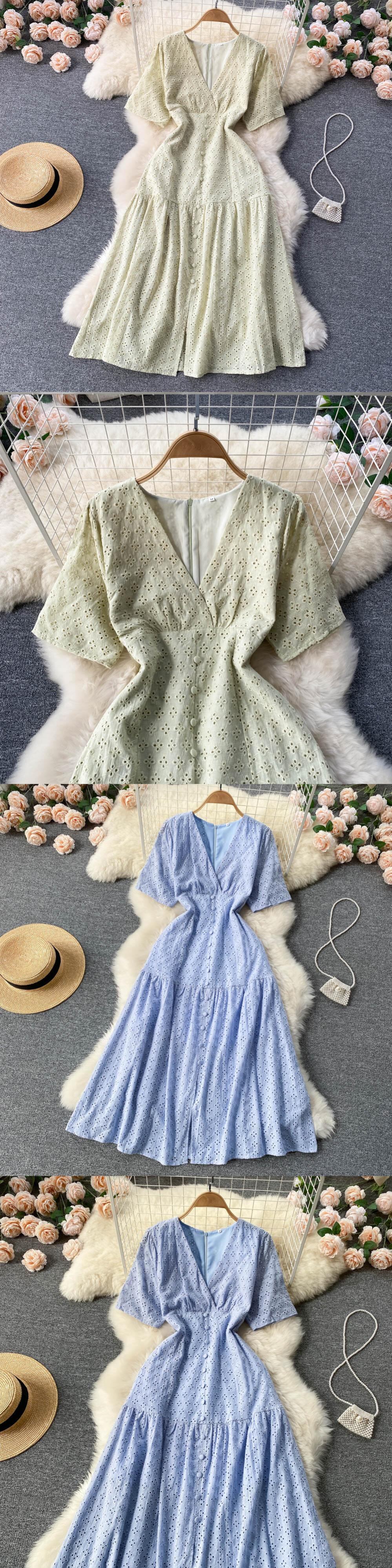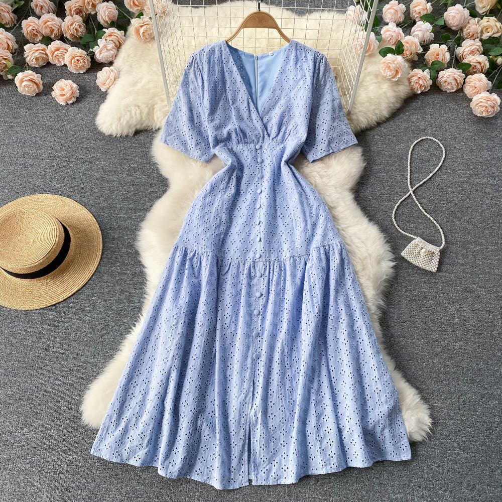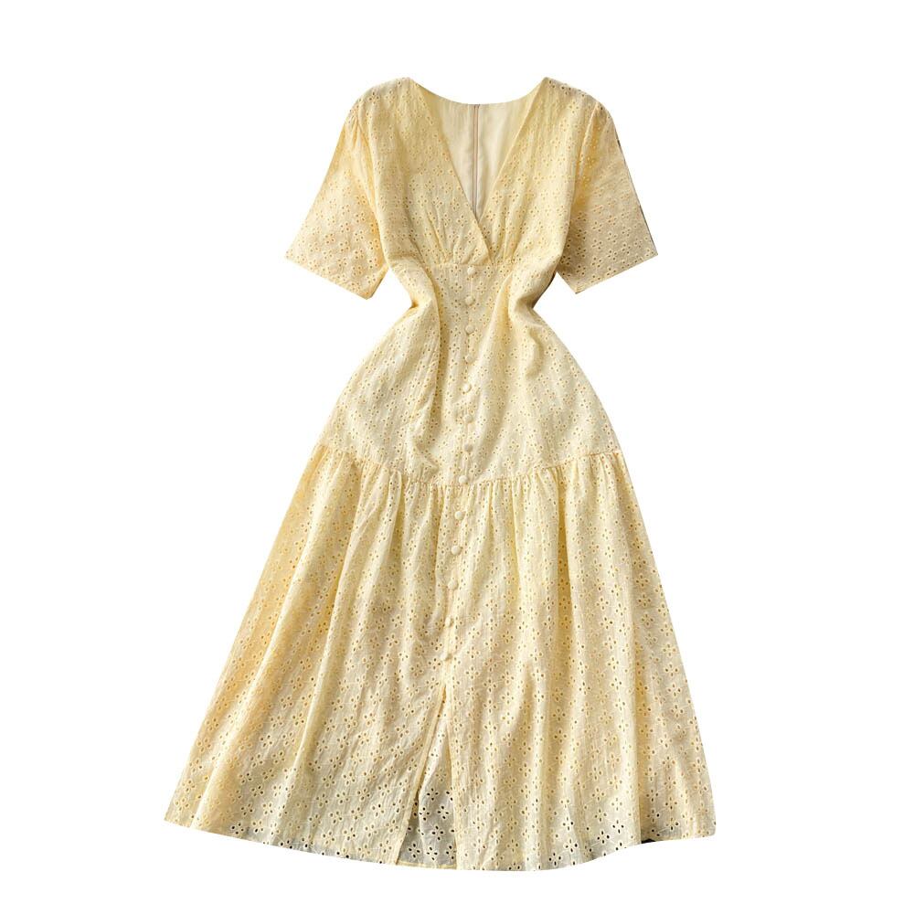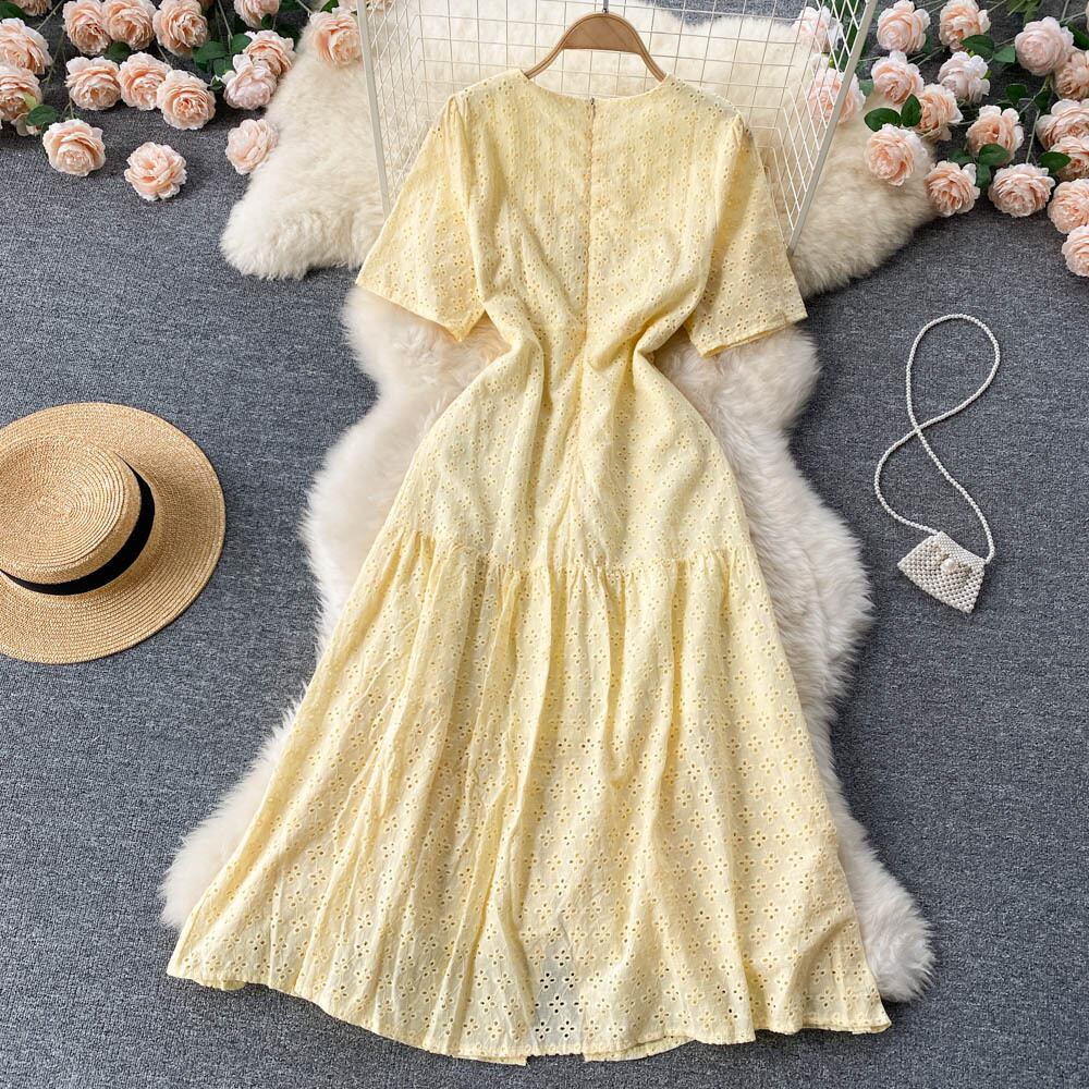 French v-neck short-sleeved dress summer 2022 new version of the solid color waist thin a-line small fresh skirt trend サマー 夏物 スカート Vネック Aライン ソリッドカラー lyxaj14667605509