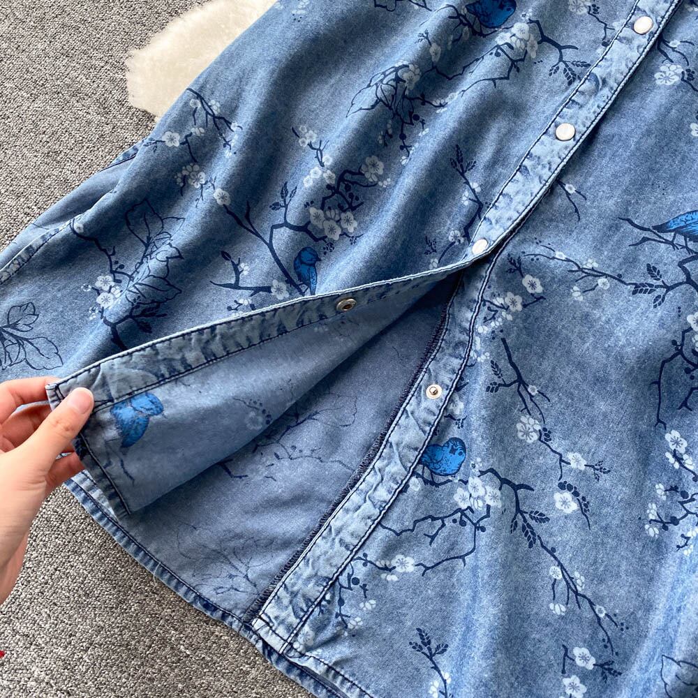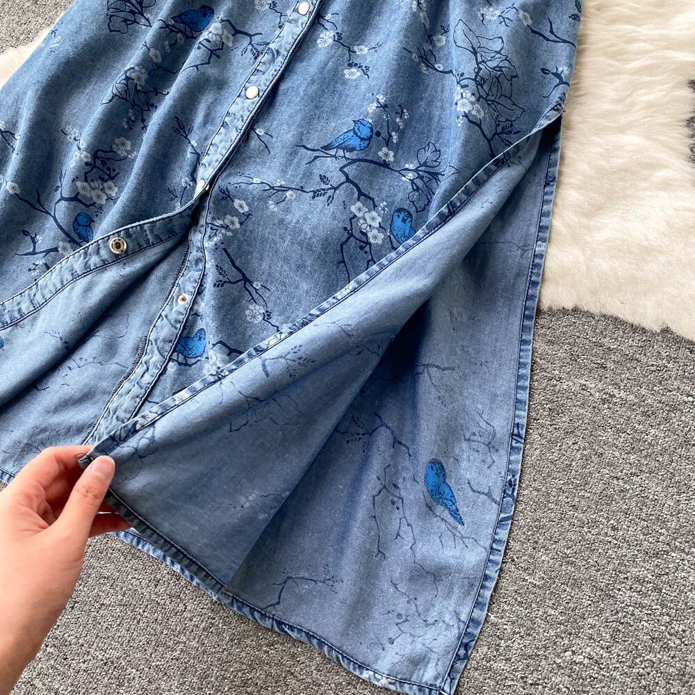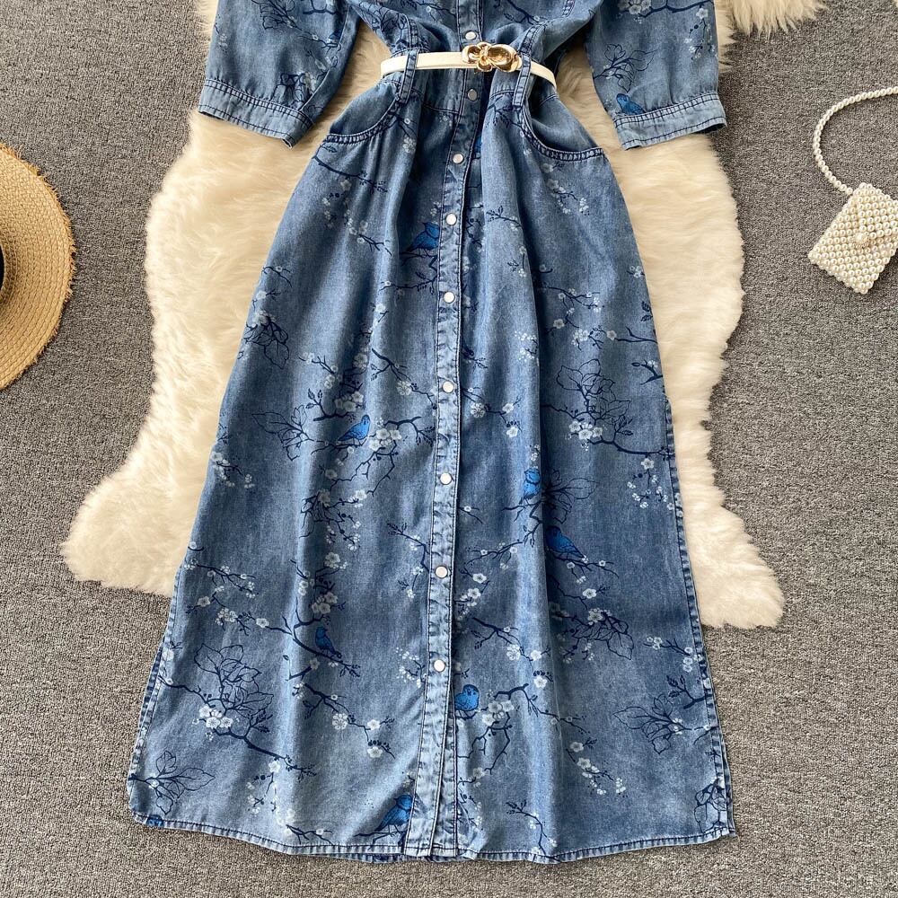 Denim dress women's retro printing design sense niche light familiar style V-neck waist slimming and age-reducing temperament long skirt ロング レトロ スカート Vネック lyxaj68732098782