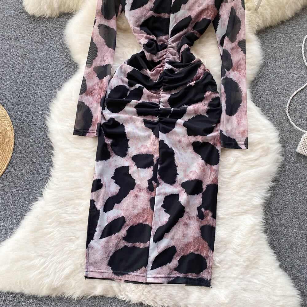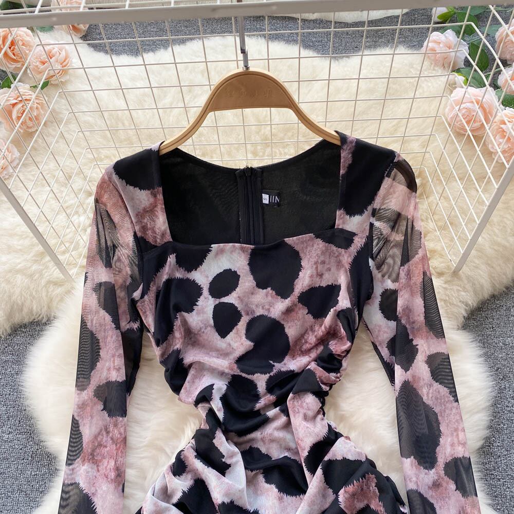 Feminine high-end leopard print long-sleeved square-neck mesh stretch tight-fitting hip dress elegant long skirt ロング エレガント メッシュ スカート スクウェア lyxaj2095630151