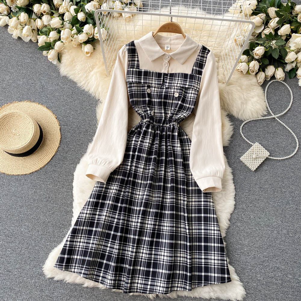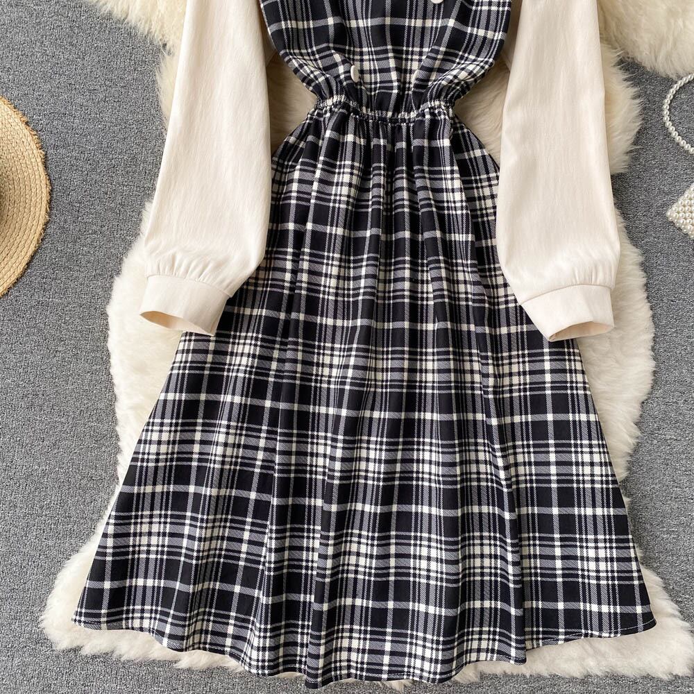 French retro college style small man waist is thin temperament age reduction literary fan fake two-piece plaid dress female レトロ lyxaj23283977843