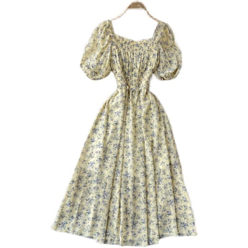 Chiffon dress women's summer dress 2021 new sweet fungus edge square collar slim mid-length floral holiday skirt シフォン 大人ガーリー スウィート キュート カジュアル サマー 夏物 花柄 スカート スリム スクウェア lyxaj25616101215