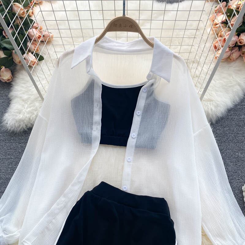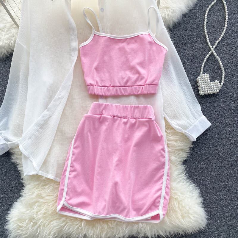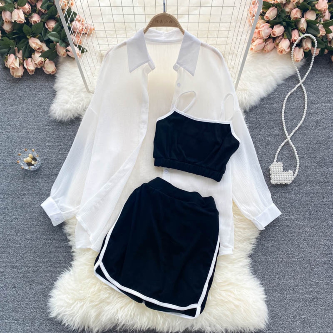 Net red fried street suit women's summer long-sleeved sunscreen shirt all-match short camisole + hip skirt three-piece set ショート ロング レッド ストリート サマー 夏物 スカート lyxaj83502654845