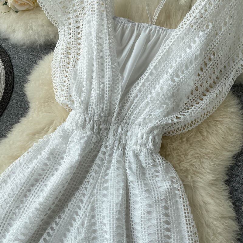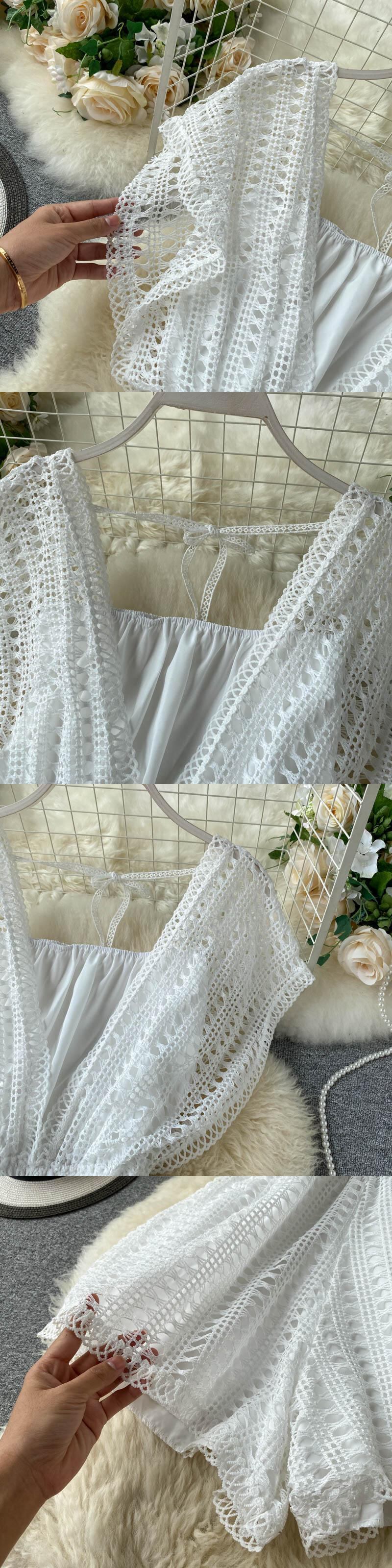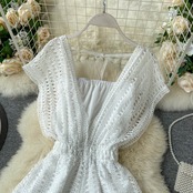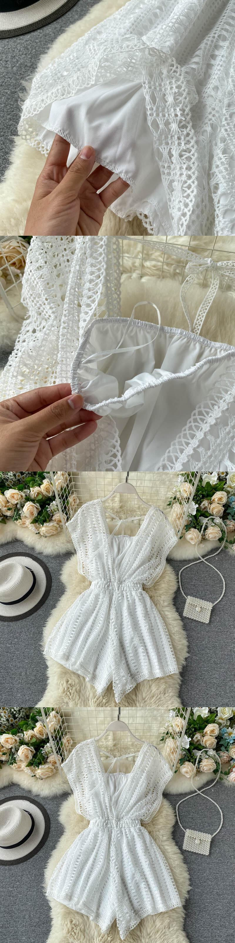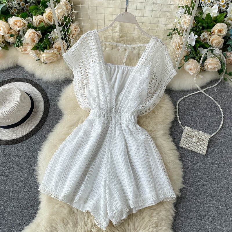 European and American ins scheming hollow V-neck elastic waist waist is thin and short wide-leg jumpsuits show legs long pants women's summer dress ショート ロング エラスティック 伸縮 サマー 夏物 Vネック ヨーロピアン lyxaj1693991317