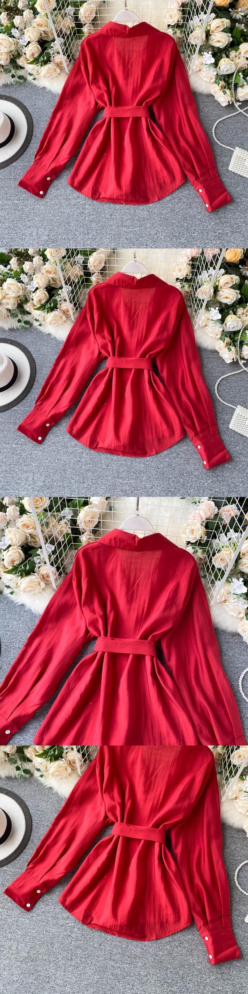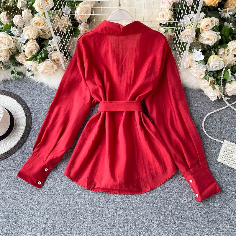 Autumn 2020 new women's shirts with lace-up waist and thin solid color all-match long-sleeved temperament bottoming tops trendy ロング レース シャツ オータム 秋物 レースアップ ソリッドカラー lyxaj33524730790