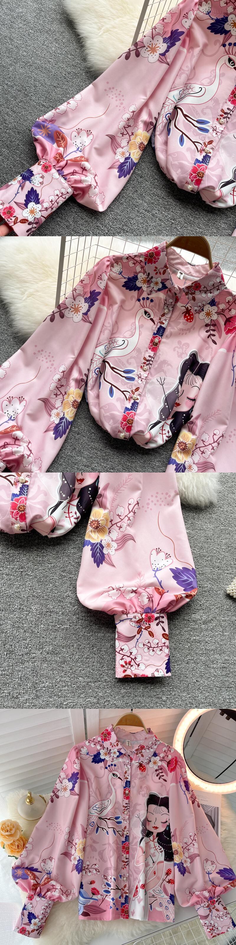 Chinese style temperament western style printed shirt women's design sense niche polo collar satin chic shirt trendy autumn clothes プリント オータム 秋物 サテン lyxaj15142579410