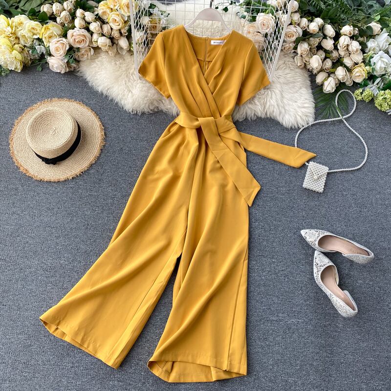 European and American style 2020 summer dress new retro fashion temperament V-neck short-sleeved waist tie wide-leg jumpsuit women's trend レトロ サマー 夏物 Vネック ヨーロピアン lyxaj97648999119