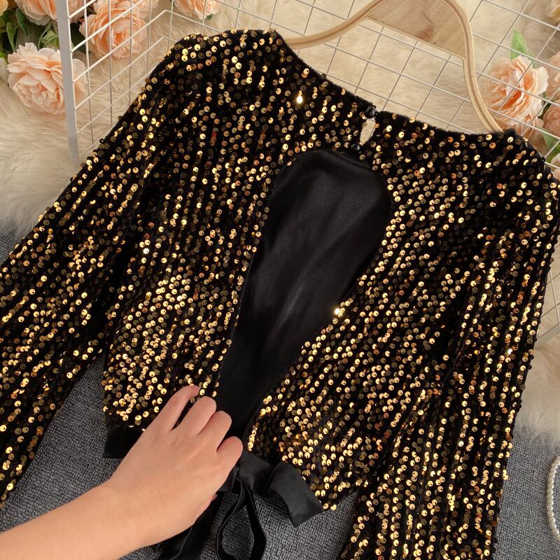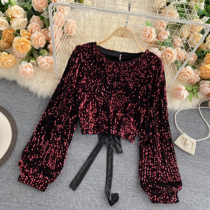 Celebrity temperament top women's autumn design sense niche scheming hollow back straps waist short sequin top women ショート オータム 秋物 lyxaj23023393913