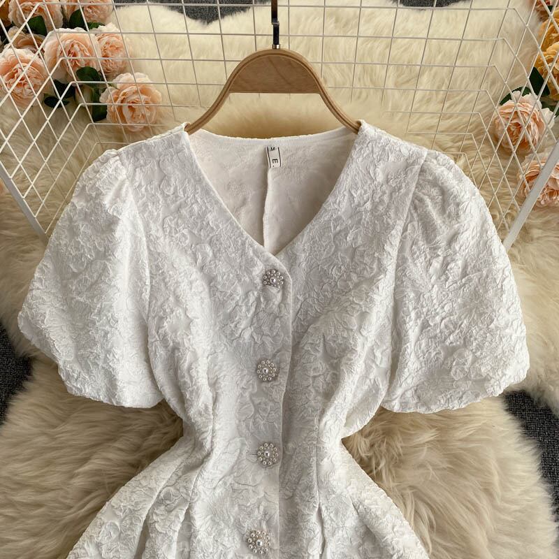 Palace style small dress ladies high-end women's retro jacquard scheming hollow out waist short puff sleeve dress ショート レトロ レース lyxaj11416072766