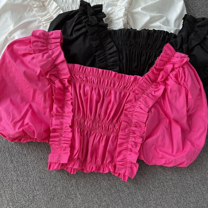 Girly short tops, women's design, small court style, puff sleeves, sweet fungus, slim fit, all-match small shirts ショート シャツ 大人ガーリー スウィート キュート カジュアル スリム lyxaj54078943603
