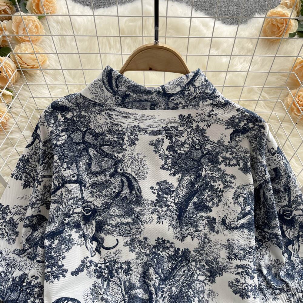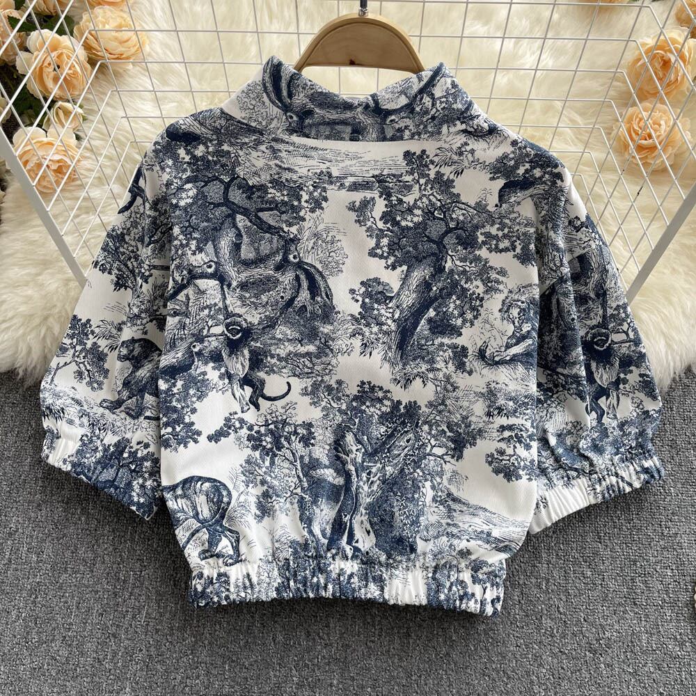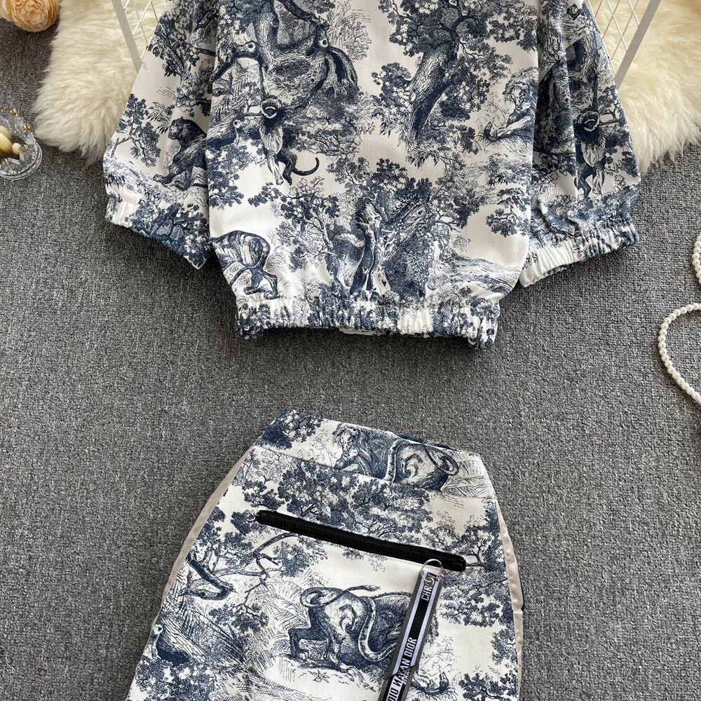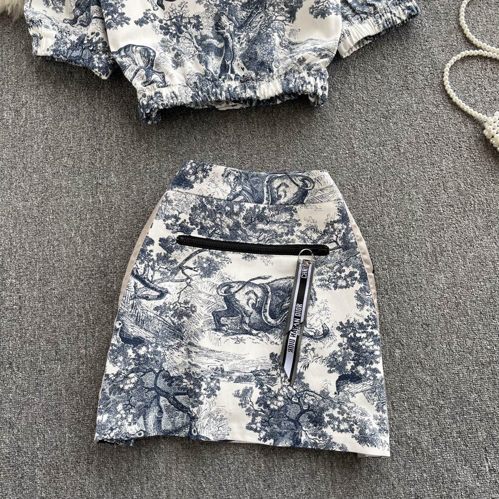 Net red fried street fashion temperament suit female tie-dye printed short shirt high waist A-line skirt Western style two-piece suit ハイウェスト ショート レッド プリント ストリート スカート Aライン lyxaj84099829919