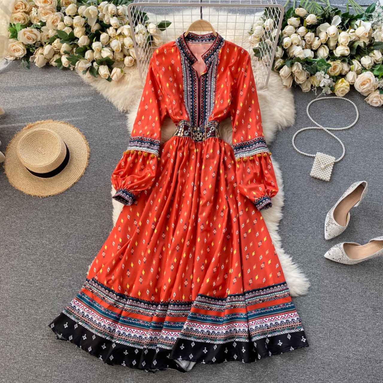 Retro ethnic dress spring new 2021 heavy industry embroidery waist thin long printed holiday skirt ロング レトロ プリント 刺繍 スプリング 春物 スカート lyxaj87817360077