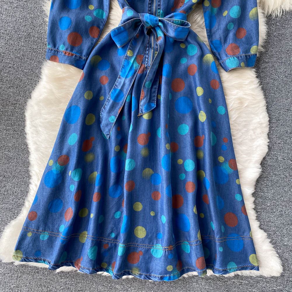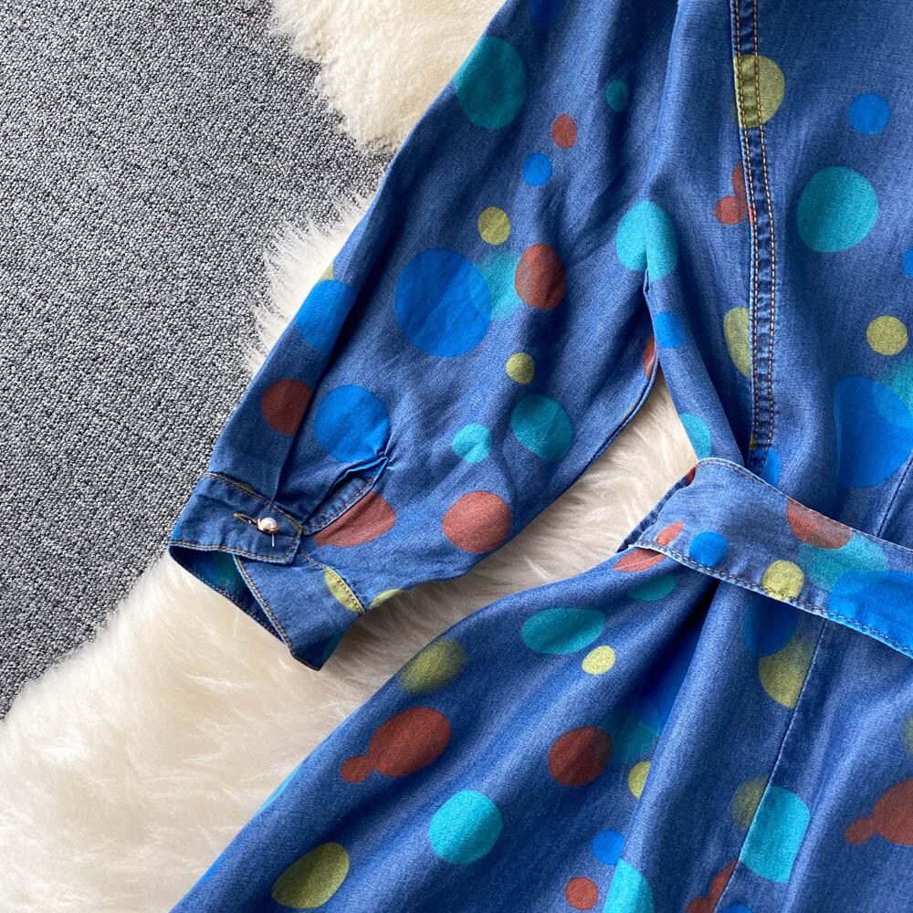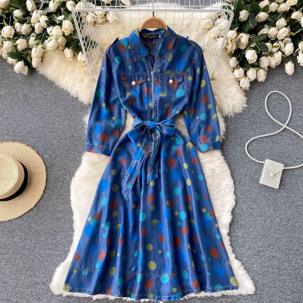 Polka dot print mid-length denim dress women's 2021 autumn and winter new lace-up waist lapel zipper A-line skirt レース オータム 秋物 ウィンター 冬物 スカート Aライン レースアップ lyxaj17142709598