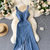 Hong Kong style waist slim denim dress scheming split commuter dating all-match light familiar temperament suspender a-line skirt スカート Aライン スリム lyxaj29548983286